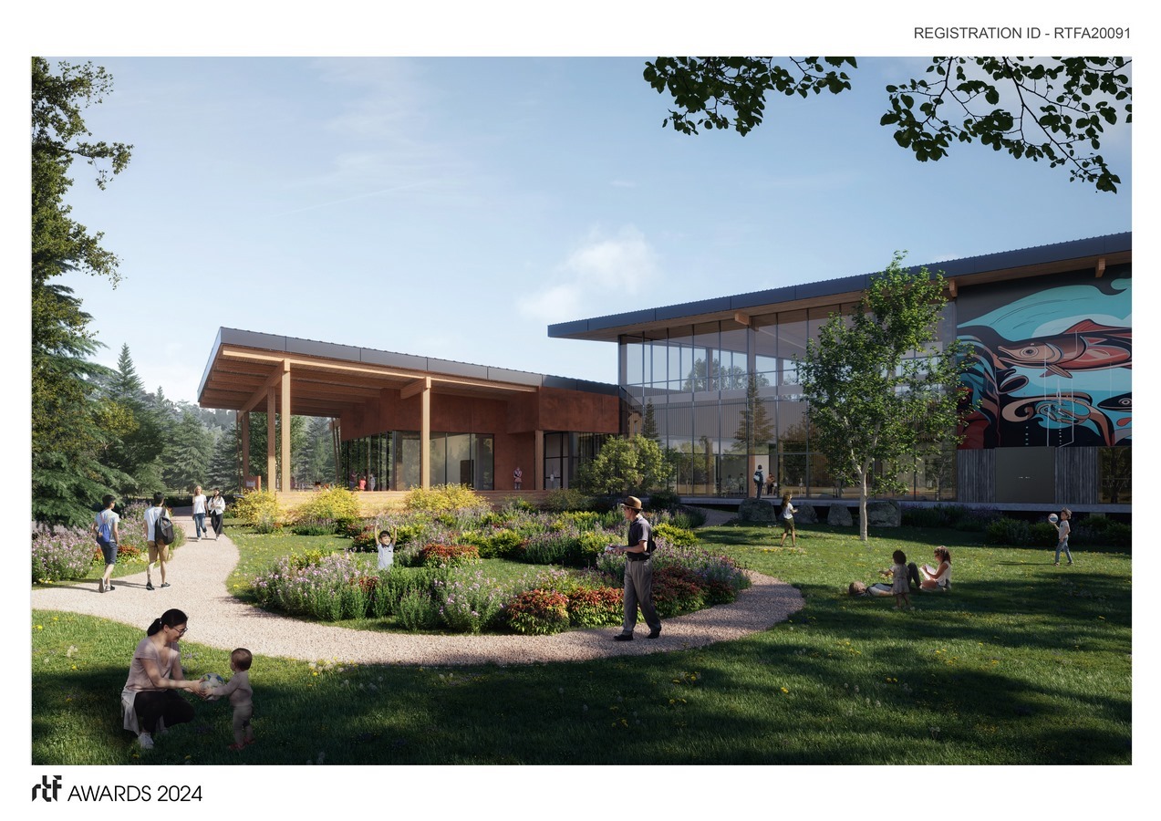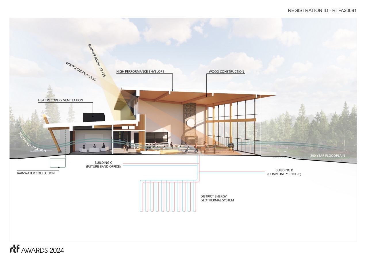 Additionally, the primary structural material is locally-sourced British Columbia mass timber with a light-frame wood sub-structure; this will reduce the building’s embodied carbon footprint. The predominant use of wood – a traditional material for the Stellat’en – will be a source of spiritual healing and reconcilliation.