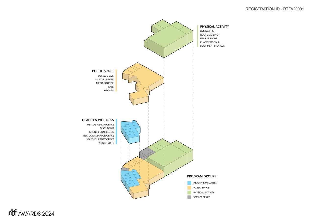 The design concept took shape through multiple community engagement sessions, which showcased a tangible desire to connect the new facility to the land and local fishing traditions. Key programming, health and wellness spaces, ancillary services, and activity spaces are connected through common areas that all link to a community fire pit, walking trails, the building entry, and community centre connection. The interior public space is seen as an extension of the exterior, and is directly connected. The youth centre will eventually be part of a trio of new facilities for the Stellat’en community, including an adjacent administration office and community centre, both of which are currently in development.