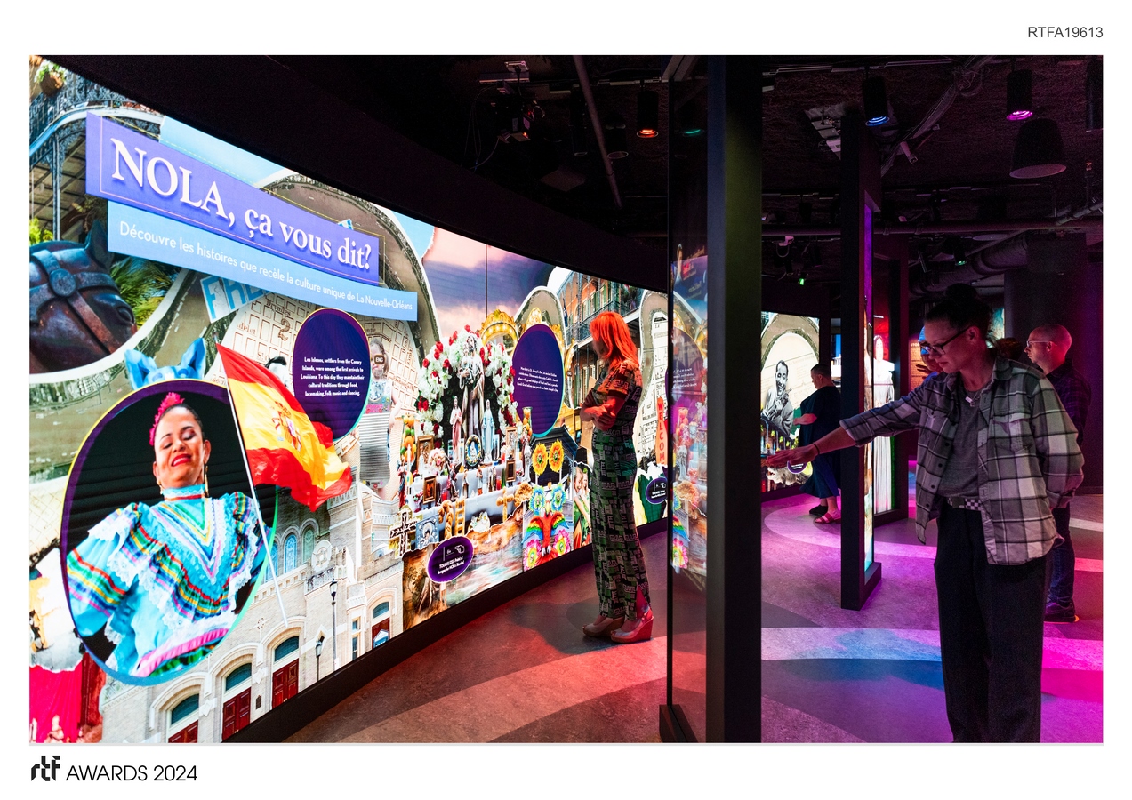 Each gallery begins with English, French and Spanish descriptions and multilingual options at the digital interactives. Visitors start at a gesture-based LED wall to meet virtual, life-size historical figures. Soul Queen Irma Thomas, voodoo practitioner Marie Laveau, and poโboy baker George Leidenheimer respond in real time to visitor engagement. At the simulated cafรฉ modeled after quintessential local restaurants, visitors learn about the cultural significance of local dishes from Chef Kevin Belton.