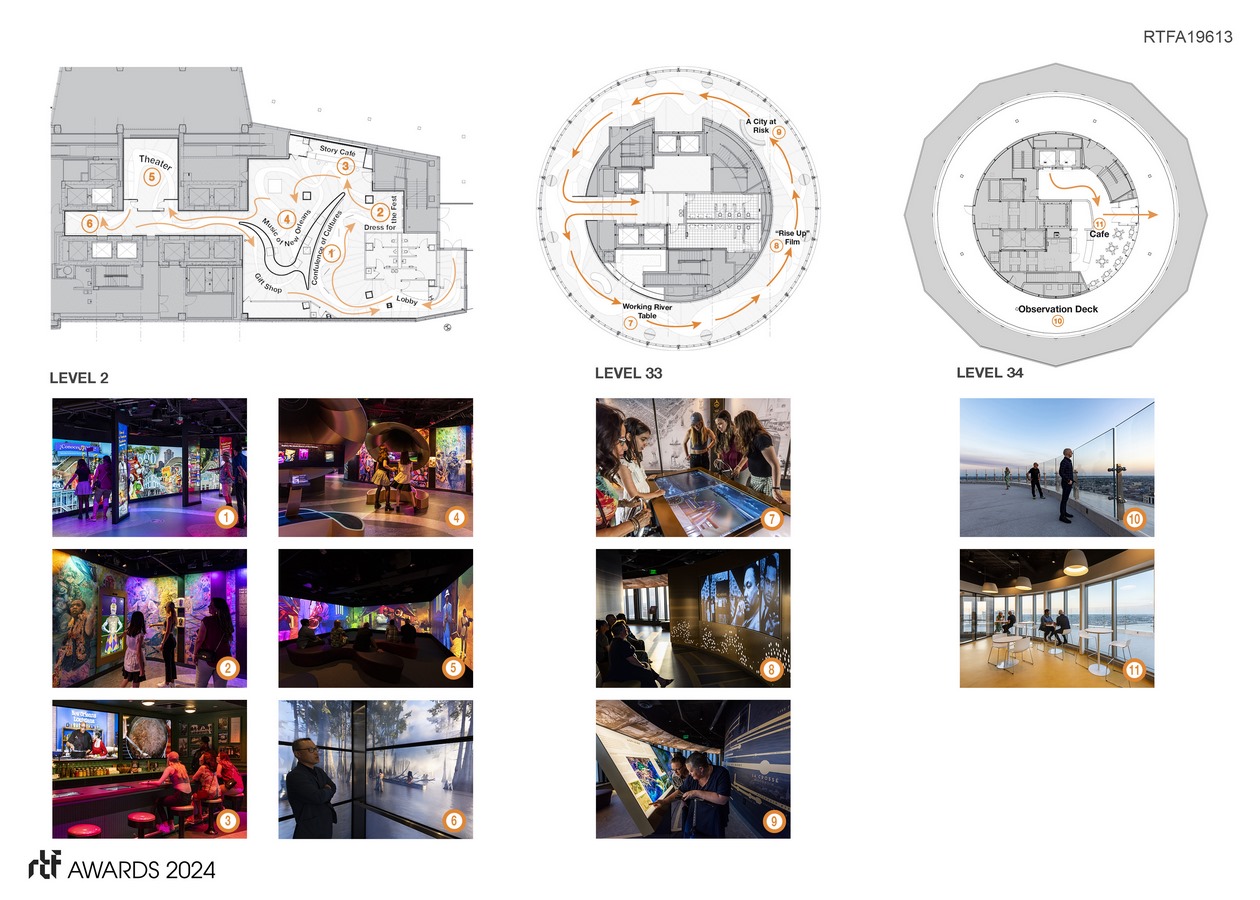 Unlike typical observation experiences, Vue Orleans creates parallels between past and present, orienting visitors to neighborhoods, landmarks and stories. A floor-spanning terrazzo compass rose orients visitors to the expansive panorama; an original mural of the river highlights significant geographic and man-made features; and the glass enclosure is annotated with a backlit ribbon of archival imagery corresponding to areas in view. ย Augmented reality viewers, echoing retro, coin-operated viewfinders, swivel, zoom and display facts about historic sites, buildings and the attractions seen beyond the windows. And highlighting the Mississippi Riverโs relationship to the city, the Working River multi-user table invites visitors to grab the wheel of a Mississippi riverboat and pilot it around notorious Algiers Point. Exhibits conclude at the exterior observation deck and cafรฉ on the 34thย floor, where visitors can enjoy unobstructed, 360-degree views of the city.