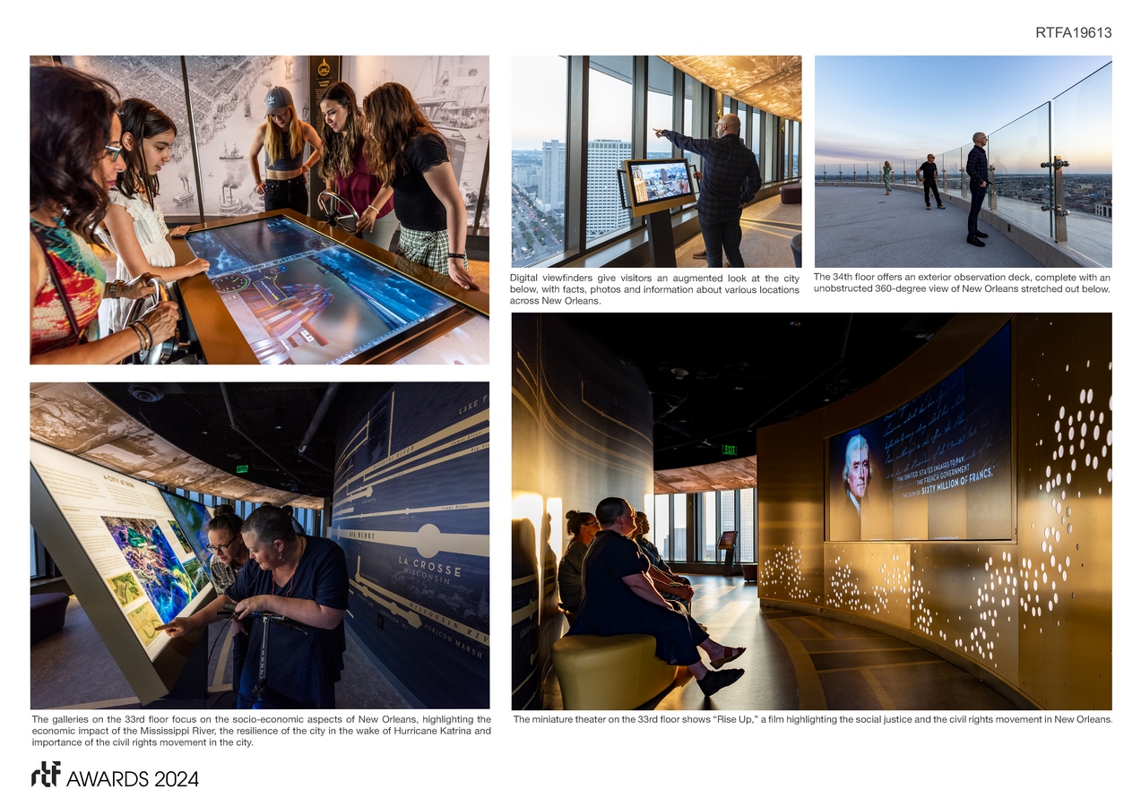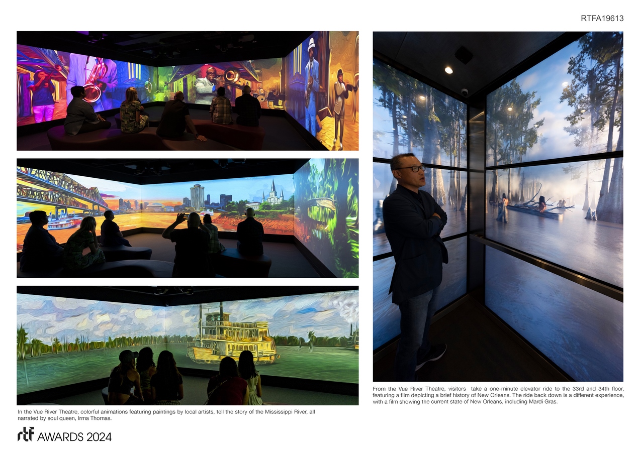 Visitors ascend from the ground-floor galleries to Floor 33 via an immersive elevator experience in which video screens surround visitors with views of a rapidly changing New Orleans, offering a one-minute history of three centuries of city growth.