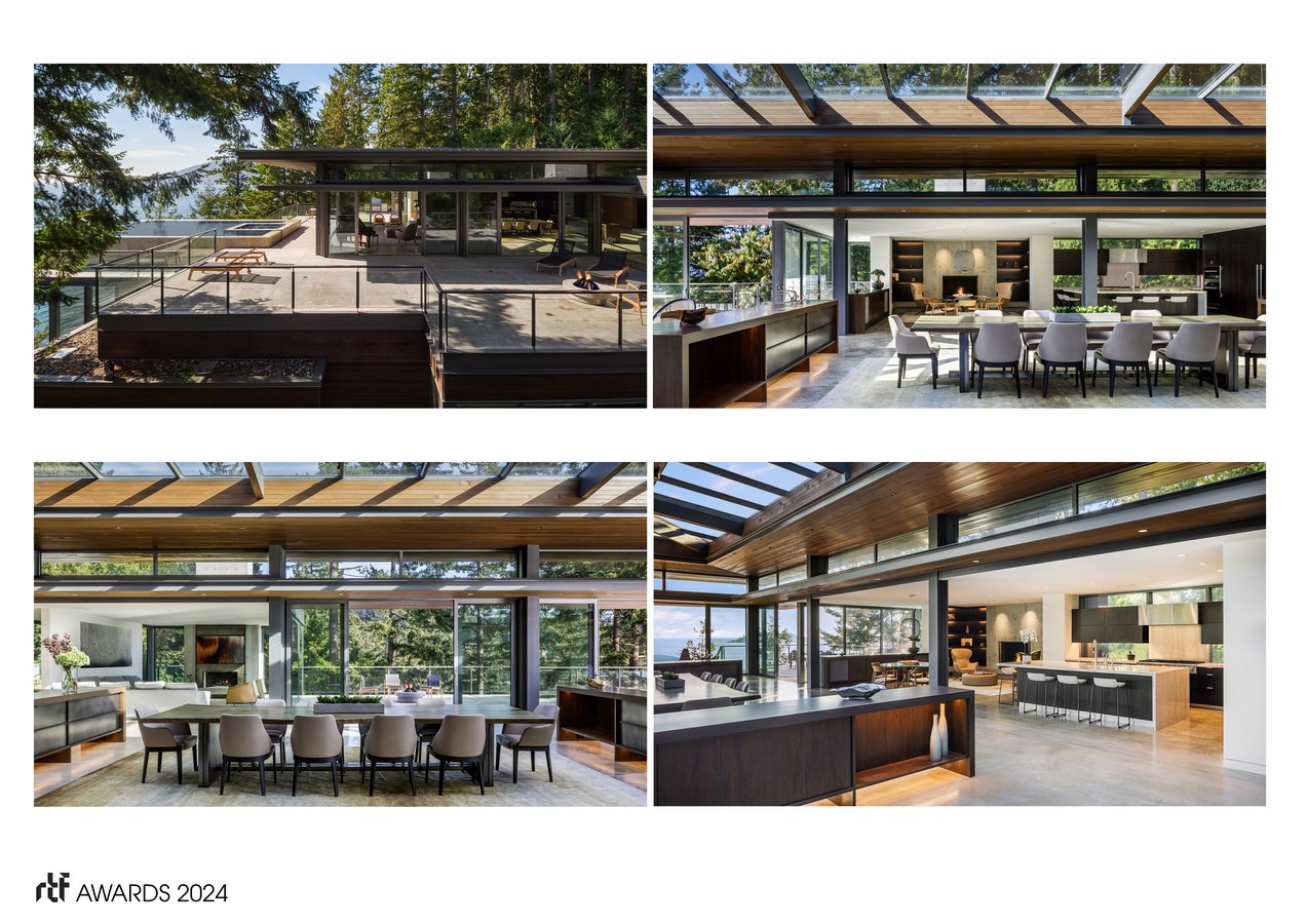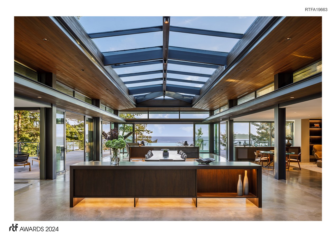 Upon entering the home, guests are presented with a dramatic grand pavilion overlooking the expansive views of the water. The openness of the plan is made intimate by nested, individual spaces within the whole that feel unique, while maintaining a sense of connection with the rest of the project. The challenge here was creating a sense of intimate, interior space without creating division or compromising views to the exterior. Each space is intentionally designed to frame the surrounding natural beauty, allowing exterior views and light to flow to the interior. Greenery covers the low slung, horizontal roofs, allowing the structure to seamlessly integrate into the landscape.