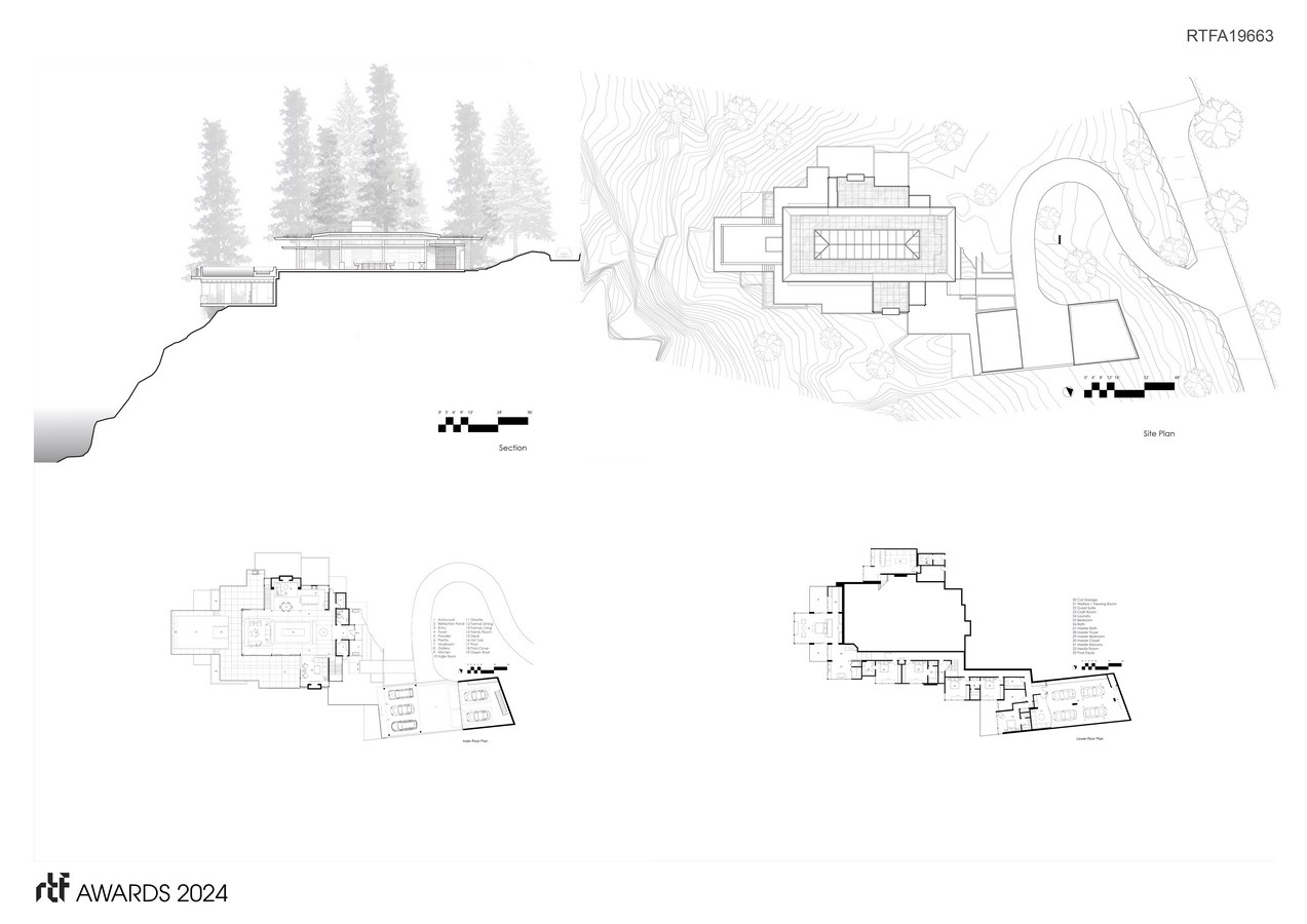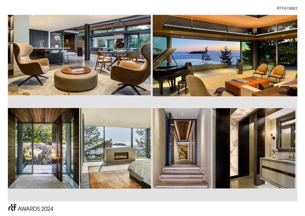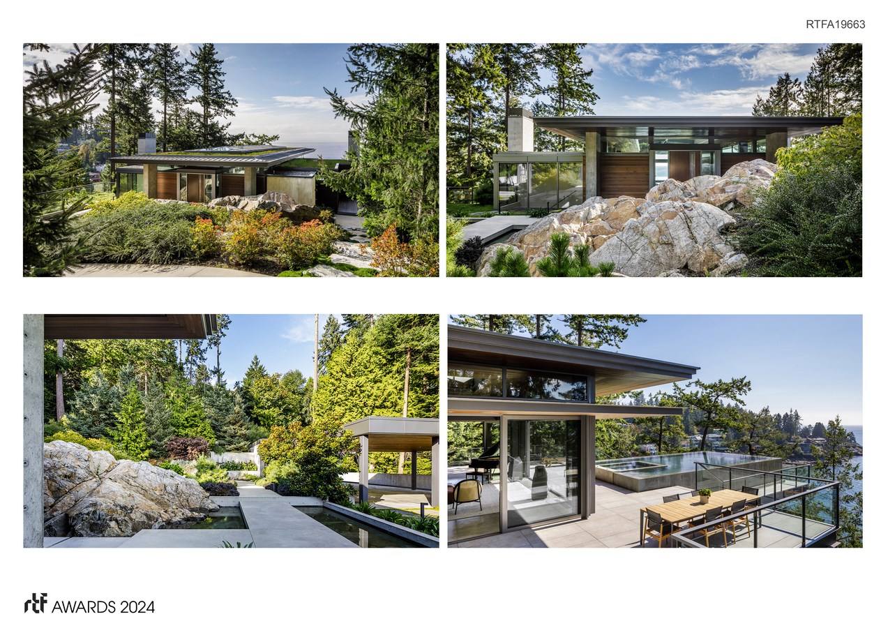 The home is sculpted into a landscape that is primarily bedrock, allowing it to elegantly interface with its surrounding environment. This lends a low, site-sensitive profile to the overall composition. This approach, along with the integration of natural elements, allows for interior spaces that seamlessly blend with the natural beauty of the surroundings.