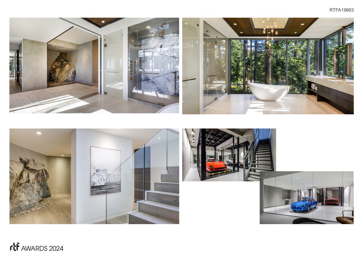 The curated palette of materials is a reflection of the natural elements on the site and surroundings. The home was nested into the bedrock, allowing natural stone to enter into the interior spaces as a unique feature. Cedar and walnut were used to foster visual warmth, while blackened steel, glass, and polished concrete afford the dramatic spans found throughout the home. Venetian plaster and textiles soften the interior spaces, as the neutral color palette evokes restfulness and contemplation.