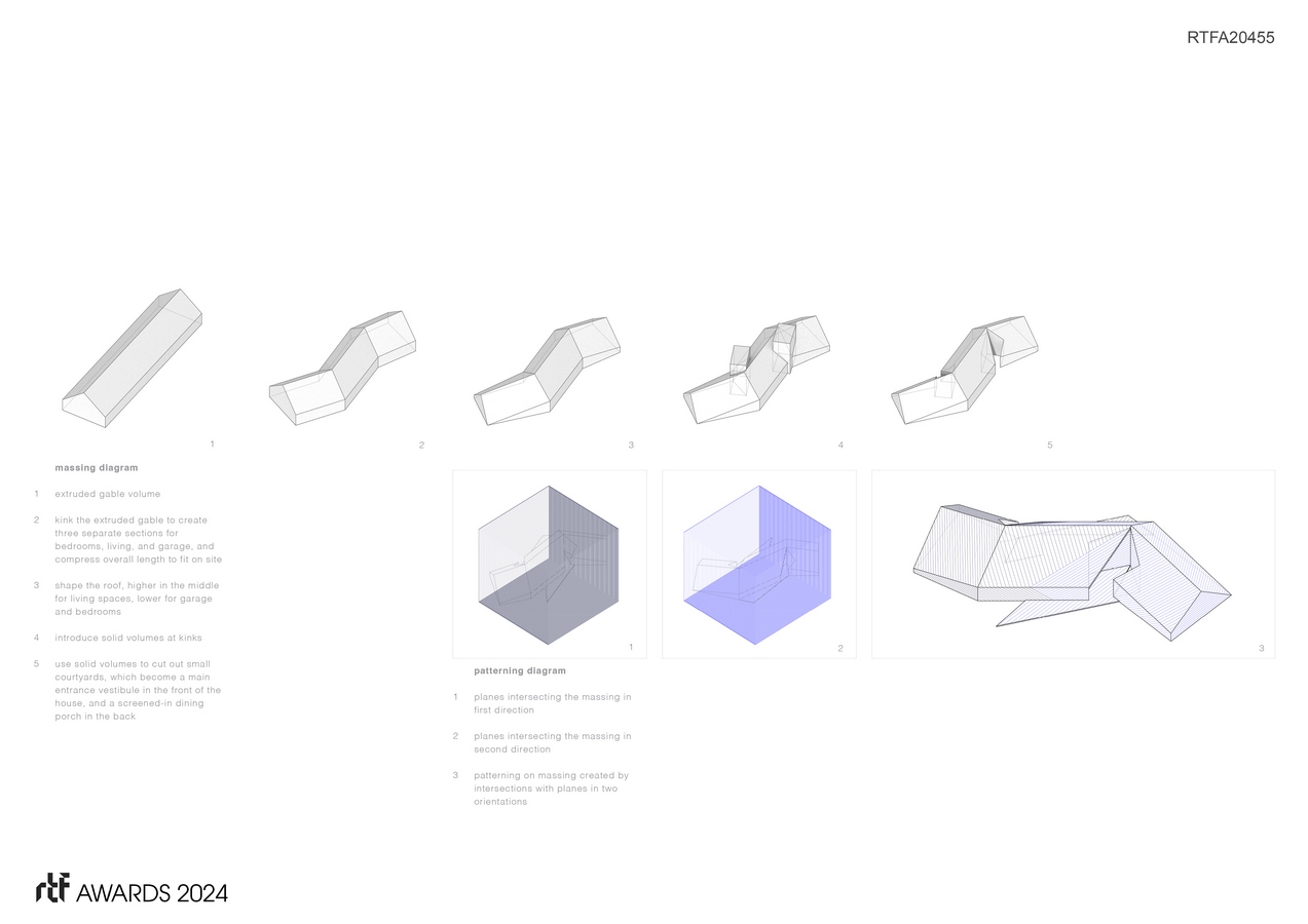 It balances the clientโs desire for traditional residential forms and materials, with an interest in exploring how these forms and materials can be used to compose residential architecture in unexpected ways. In this project, the traditional, iconic gable form has been extruded and manipulated to organize the main interior and exterior spaces of the house, and patterns defined by typical residential cladding materials have been tilted and rotated to create complimentary wall and roof facades.