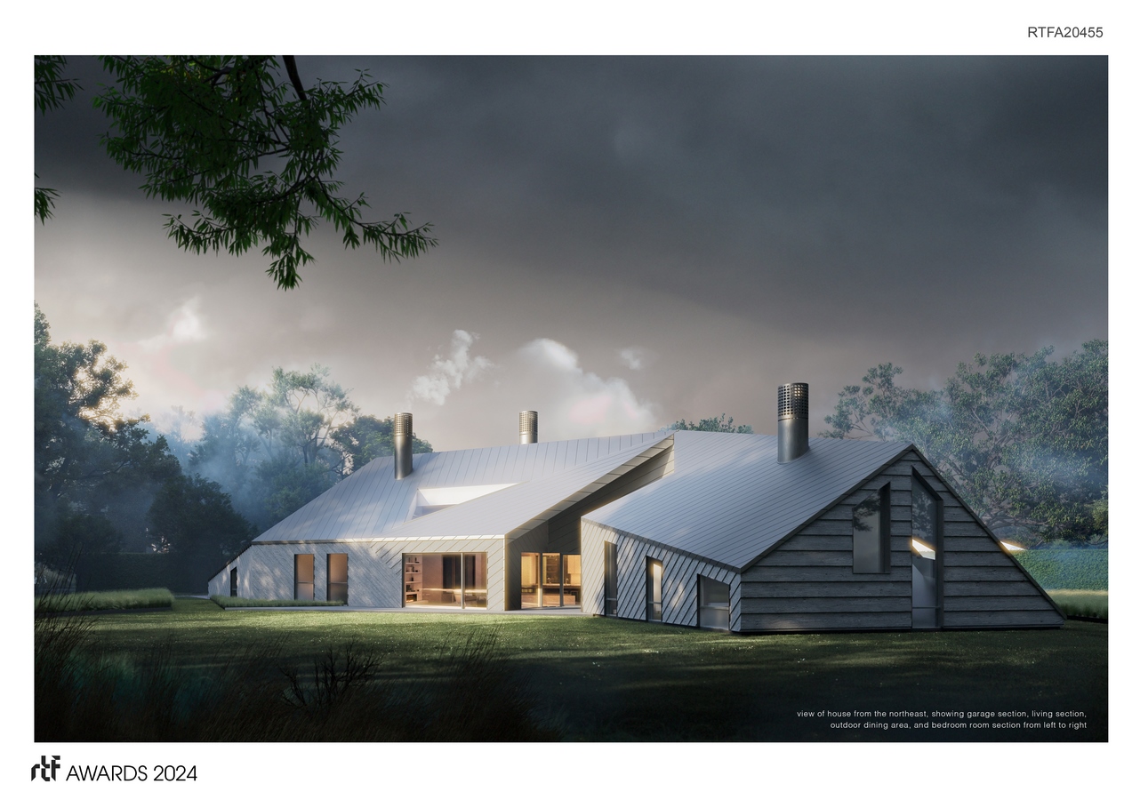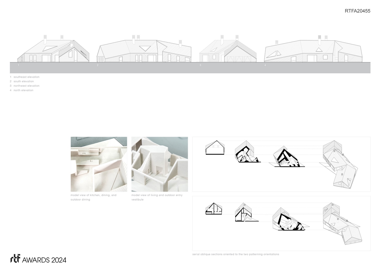Patterning of the exterior cladding materials is defined by two sets of lines, projected from two different orientations onto the building form. The projected lines run continuously over exterior surfaces of the house, the roof, walls, and decks. They are used to define spacing and orientation of metal roofing and wood siding. The result is a building derived from iconic form and traditional materials that clearly conveys its residential character, but it does so in an unconventional manner.