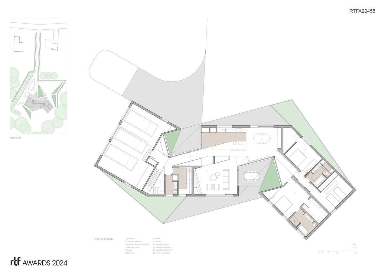 The basic form of the house is an extruded gable, which is bent into a ‘zag.’ The three legs of the zag organize the house into three zones, one for bedrooms, one living spaces, and one for a garage. Ceiling heights in the bedrooms and garage are lowered, distorting the original gable form, and reducing volume where it is not needed in less public zones of the house. Two rectilinear volumes are carved from the zag at its bends to create two semi-covered outdoors spaces, an entry vestibule at the front of the house, and an outdoor dining area at the back. Planting and glazing in and around these outdoor spaces bring the outdoors in, and the indoors out.