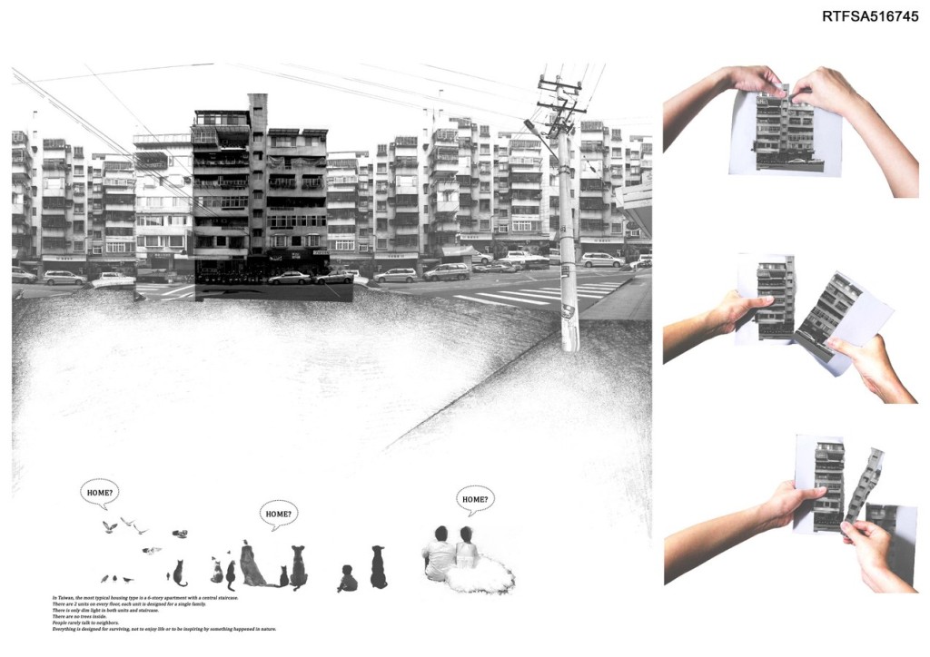 In Taiwan, the most typical housing type is a 5-story apartment with a central staircase. There are 2 units on every floor, each unit is designed for a single family. There is only dim light in both units and staircase. People rarely talk to neighbors. There are no trees inside. Everything is designed for surviving, not to enjoy life or to be inspiring by something happened in nature.