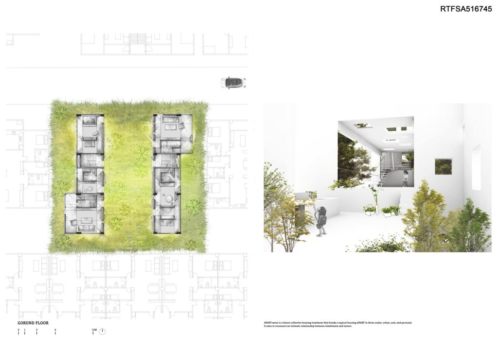 APART-ment is a future collective housing treatment that breaks a typical housing APART in three scales: urban, unit, and personal. It aims to reconnect an intimate relationship between inhabitants and nature.