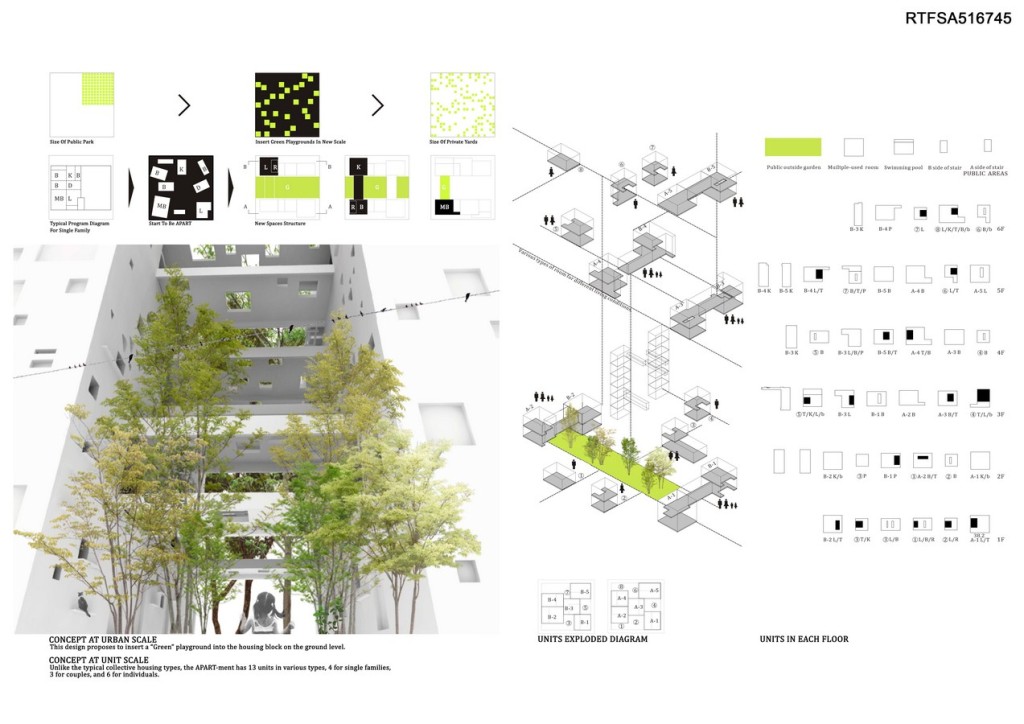 At unit scale, unlike the typical collective housing types, the APART-ment has 13 units in various types, 4 for single families, 3 for couples, and 6 for individuals. In the single families units, each has a “bridge room “ stretched above the “Green” playground in different heights. The “bridge room” strategy creates more communal experiences for its inhabitants. It also promotes desired interactions for the residents and the surroundings.