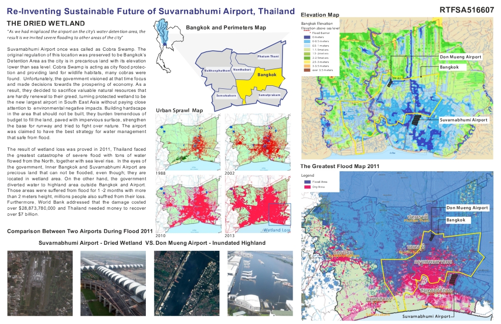 Detention Area as the city is in precarious land with its elevation lower than sea level. Cobra Swamp is acting as city flood protection and providing land for wildlife habitats, many cobras were found. Unfortunately, the government visioned at that time focus and made decisions towards the prospering of economy. As a result, they decided to sacrifice valuable natural resources that are hardly renewal to their greed, turning protected wetland to be the new largest airport in South East Asia without paying close attention to environmental negative impacts. Building hardscape in the area that should not be built, they burden tremendous of budget to fill the land, paved with impervious surface, strengthen the base for runway and tried to fight over nature. The airport was claimed to have the best strategy for water management that safe from flood.