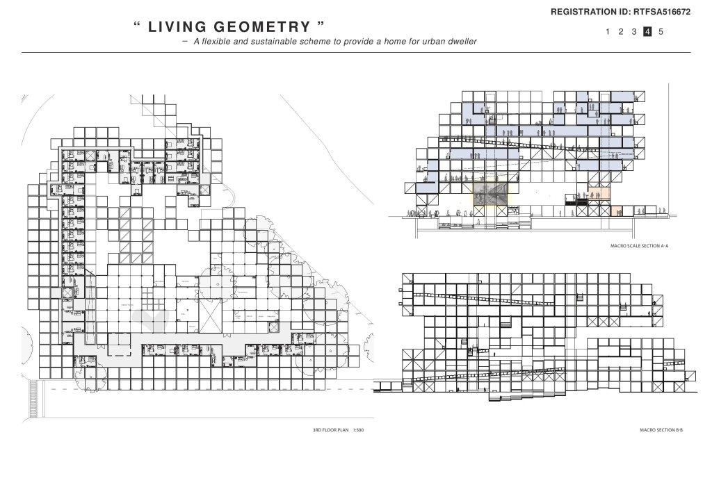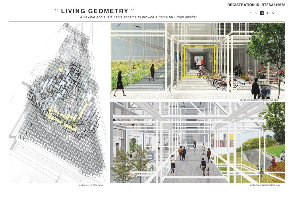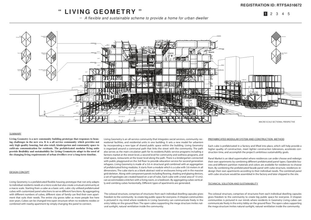 Living Geometry is an allservice community that integrates social services, community recreational facilities, and residential units in one building. It sets a new model for urbanism by incorporating a new type of shared public space within the building. Living Geometry is organized around a communal path that links the street with the community. The path also serves as the main circulation path for its residents.Public service programs including a farmers market at the street level, a second level for community and wellness programs, and retail space, restaurants at the lower level along the path. There is a kindergarten connected with public playground on the 3rd floor to provide education service for second generation refugees. Living Geometry is made of a 3.6 m structural grid combined with an aggregation of prefabricated living modules. It starts from a module which is a cube with 3.6 meters in all dimensions. The cube starts as a blank abstract void or enclosures living unit in the massive grid skeleton. Along with component panels including flooring, shading and glazing devices, a set of typologies are created based on a set of rules. Each cube with a total area of 13 sm2. can accommodate a kitchen with a living room, or a bedroom. By aggregating cubes vertically and combing cubes horizontally, Different types of apartments are generated.