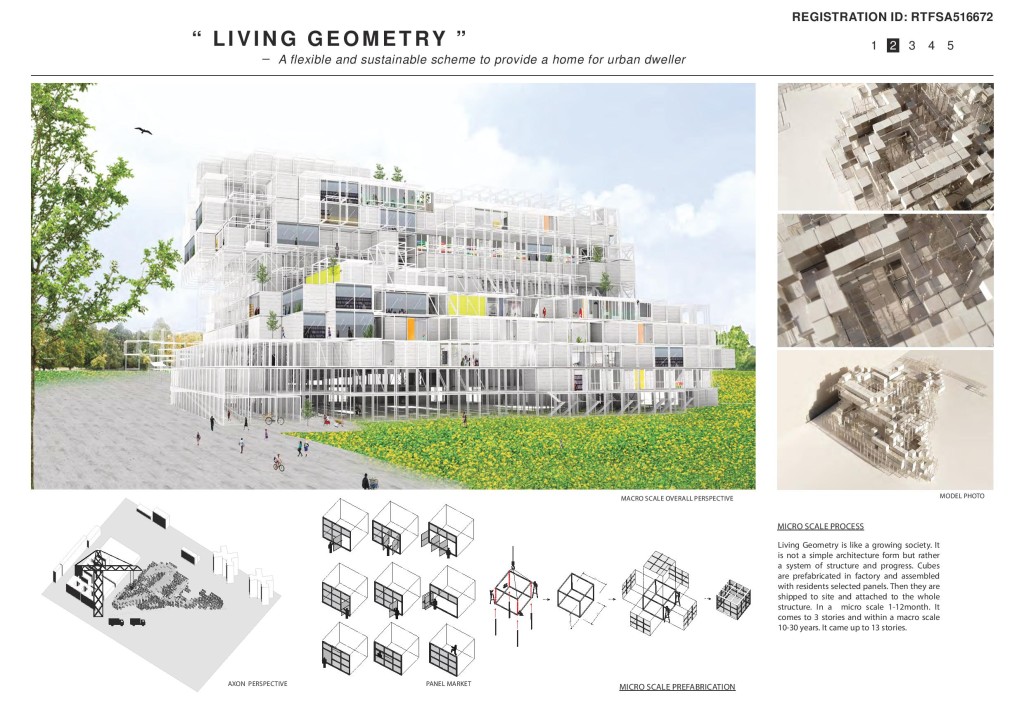 Living Geometry is a prefabricated flexible housing prototype that not only adapts to individual residents needs at a micro scale but also create a mutual community at a macro scale. Starting from a cube as a basic unit, cubic city utilized prefabricated cubes with customized panel selections to serve different functions. By aggregating with different numbers of cubes, different sizes of family can find their own apartment that suits their needs. The entire city grows taller as more people live here over years. Cubes can be changed into open structure when no residents resides or combined with nearby apartment by simply changing the panel to connect.