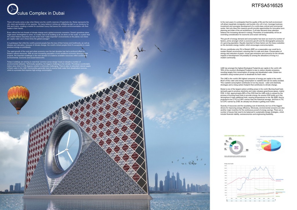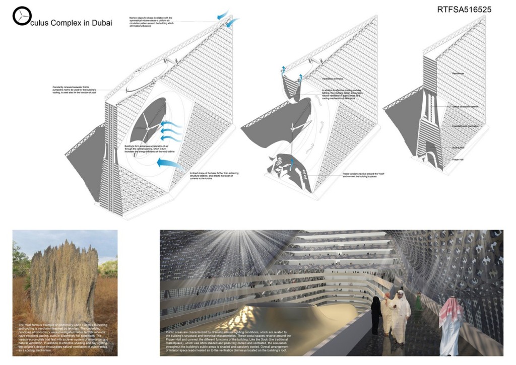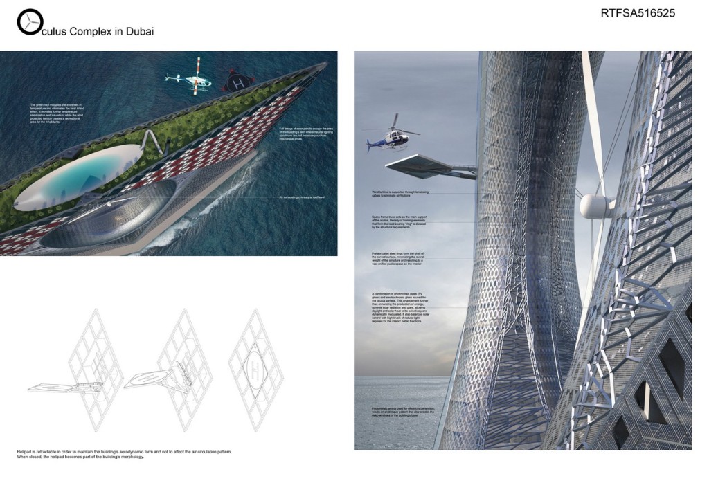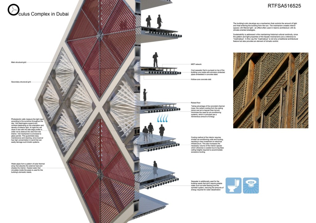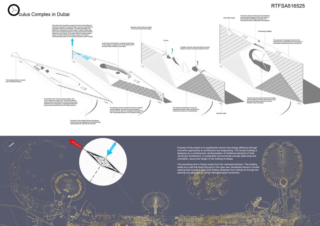 Imagine a sea-based community building that uses seawater as a cooling mechanism in order to minimize the dependence on electricity. Purpose of this project is to significantly improve the energy efficiency through innovative approaches to architecture and engineering. The Oculus building is designed as a contemporary reinterpretation of traditional elements of Arab vernacular architecture. A sustainable environmental concept determines the orientation, layout and design of the building envelope.