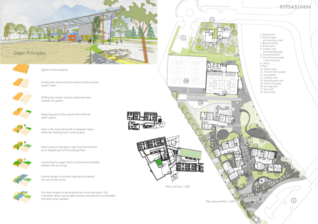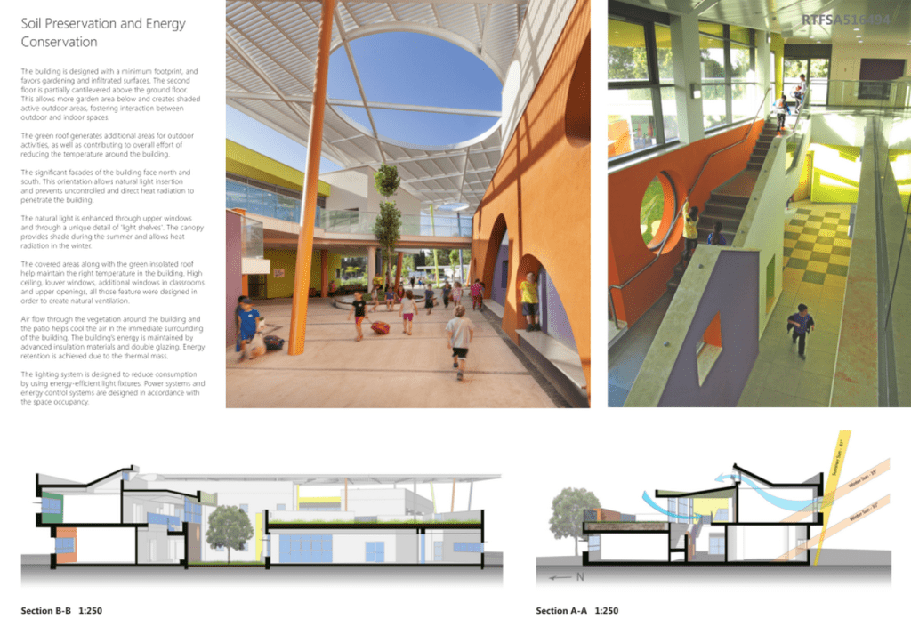 The school uses a verity of sustainable solutions as part of its overall design: Soil preservation, heat island effect reduction, energy conservation, rainwater and air-condition water harvesting and the use of recycled materials.