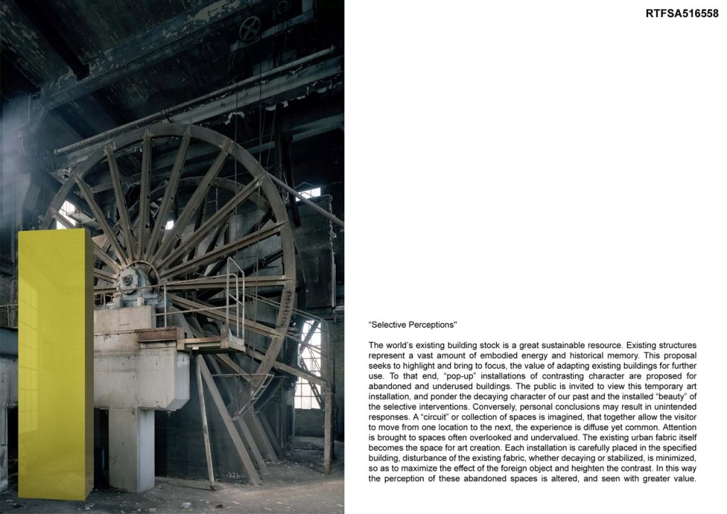 To that end, “pop-up” installations of contrasting character are proposed for abandoned and underused buildings. The public is invited to view this temporary art installation, and ponder the decaying character of our past and the installed “beauty” of the selective interventions. Conversely, personal conclusions may result in unintended responses.