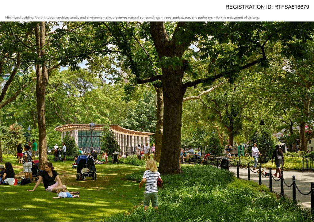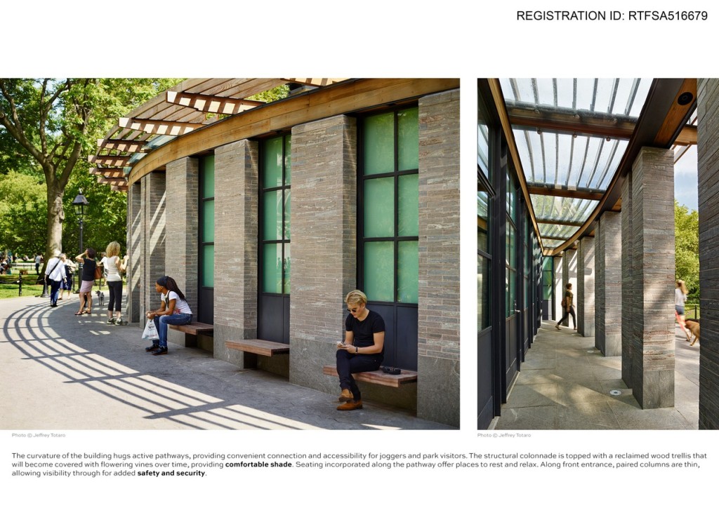 Above ground, a colonnade of New York Champlain Valley granite flecked with white, pink, and green is topped by a warm wooden trellis. The design inhabits the colonnaded trellis, an archetype of garden architecture, to harmonize with the park setting. The subtle curvature and tapered ends of the structure minimize its mass, while several regionally sourced materials reflect the park’s natural palette. The trellis is made of redwood reclaimed from New York City water tower tanks and pickle barrels, and the steel windows are made of 98.5% recycled material.