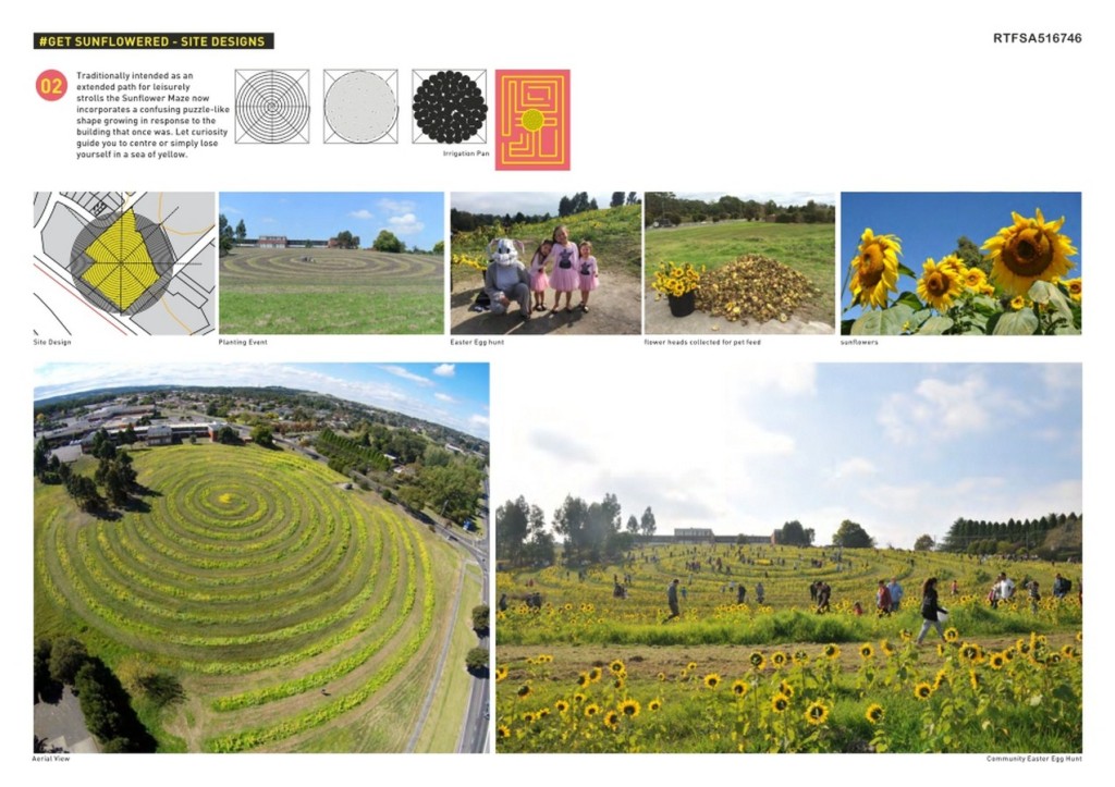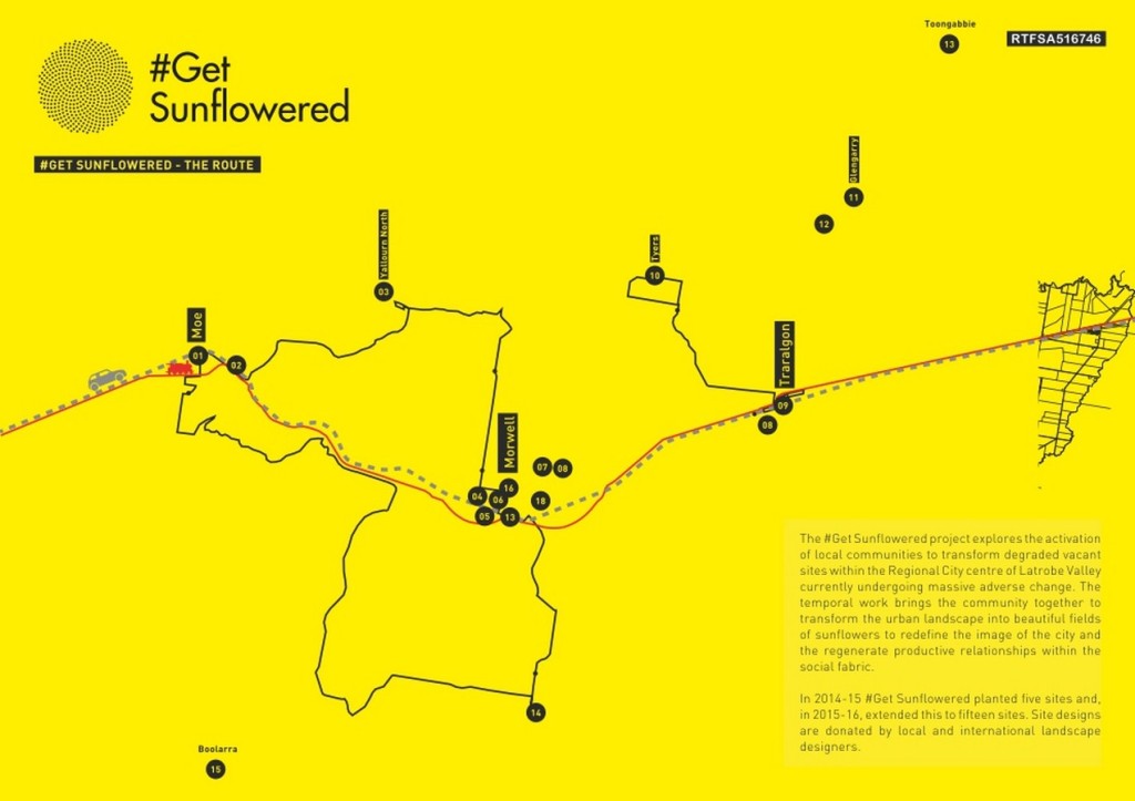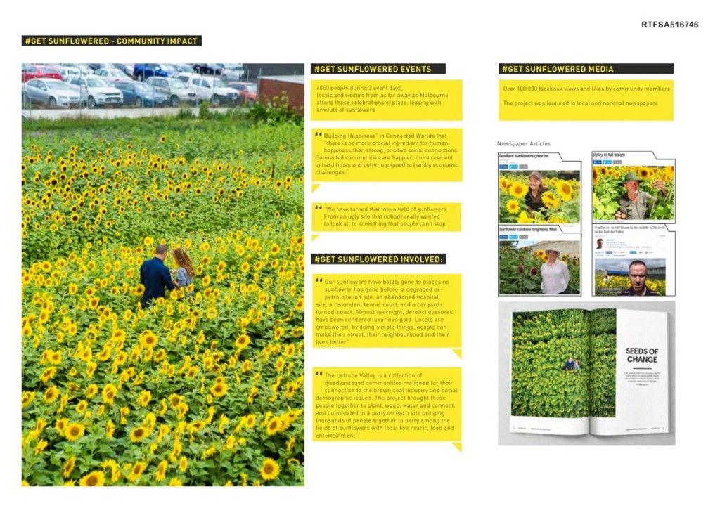 The #Get Sunflowered project explores the activation of local com m unities to transform degraded vacant sites within the Regional City centre of Latrobe Valley currently undergoing massive adverse change. The temporal work brings the community together to transform the urban landscape into beautiful fields of sunflowers to redefine the image of the city and the regenerate productive