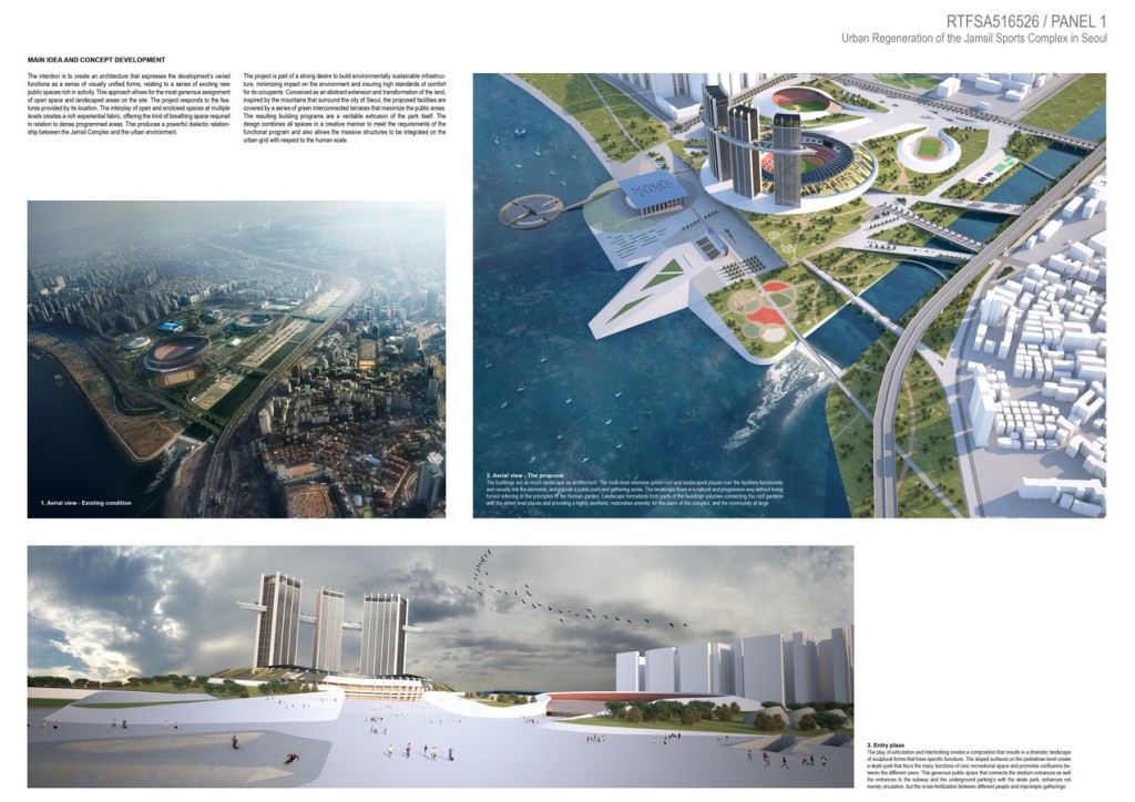 The project is part of a strong desire to build environmentally sustainable infrastructure, minimizing impact on the environment and insuring high standards of comfort for its occupants. Conceived as an abstract extension and transformation of the land, inspired by the mountains that surround the city of Seoul, the proposed facilities are covered by a series of green interconnected terraces that maximize the public areas. The resulting building programs are a veritable extrusion of the park itself. The design combines all spaces in a creative manner to meet the requirements of the functional program and also allows the massive structures to be integrated on the urban grid with respect to the human scale.