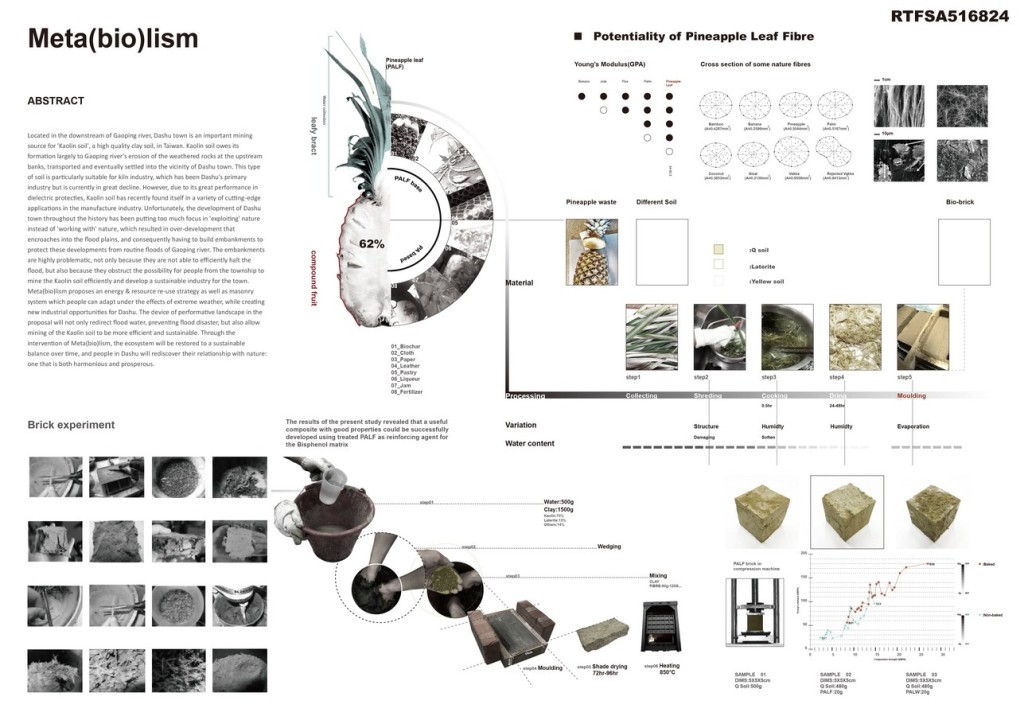 Meta(bio)lism proposes an energy & resource re-use strategy as well as masonry system which people can adapt under the effects of extreme weather, while creating new industrial opportunities for Dashu. The device of performative landscape in the proposal will not only redirect flood water, preventing flood disaster, but also allow mining of the Kaolin soil to be more efficient and sustainable. Through the intervention of Meta(bio)lism, the ecosystem will be restored to a sustainable balance over time, and people in Dashu will rediscover their relationship with nature: one that is both harmonious and prosperous.