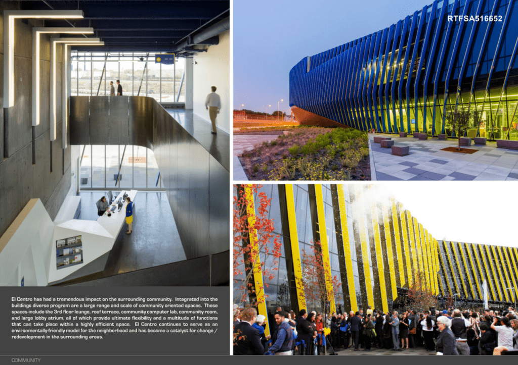 The integrated design process allowed the team to select synergistic systems that optimize energy performance and improve the thermal envelope. The building’s sculptural form and strategically located fins create an efficient sun-shading and acoustical-buffering barrier, protecting students from the intensity of the setting western sun and the roar of rush hour traffic. Daylight harvesting as well as the LED lighting and occupancy sensors have tremendously reduced the interior lighting power density. Atop the building sits an 80-kilowatt photovoltaic array that covers the cantilevered roof and reduces El Centro’s reliance on alternate sources of nonrenewable energy by offsetting 9% of the buildings energy use. Lastly, a low U-value thermally broken curtain wall system was utilized lower the mechanical load while still providing natural light to virtually every space within the building. Consequently, El Centro has achieved an energy cost savings of about 30 percent from a similar building of its size and use.