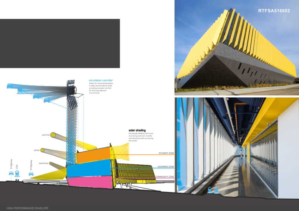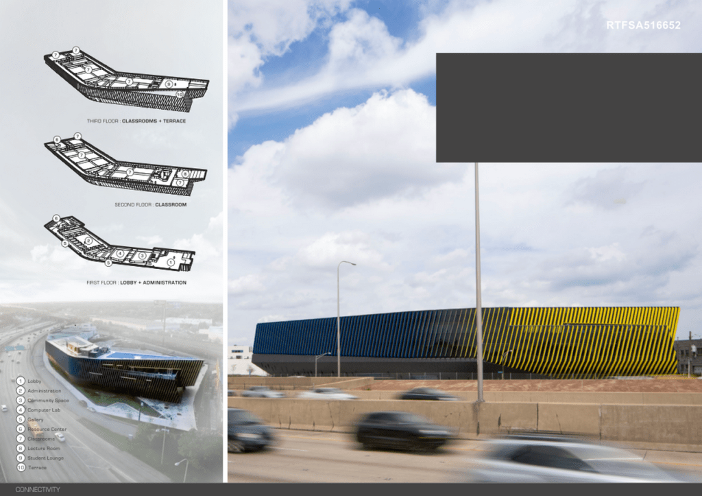 The building’s design is inspired by the unique site geometry and creates a dialogue with expressway passengers who are the captive audience during their inbound and outbound commutes. The architecture asserts its presence, through twisting roof forms and the bold school colors prominent on the vertical louvers rhythmically arrayed along the building’s exterior. Integrated into the buildings diverse program are a large range and scale of community oriented spaces, all of which provide ultimate flexibility and a multitude of functions. Sustainability represents a heightened environmental awareness in the building design. However, it is the project’s ability to inspire minor youth to attend a higher education institution that creates an undeniable cultural of sustainability.