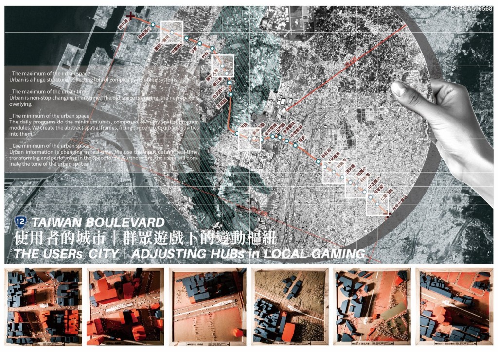 The site, Taiwan Boulevard is the main road in the Taichung City ( in the middle of Taiwan ). It starts from the train station ( inside the city ) to the port ( the far suburb ). It also displays the different faces of the city. The city is non-stop extending itself, but it is an empty city. The city is filled with lots of buildings, but there are not enough people to support the spaces. The city lost the users’ mind in the urban space. So I choose the bus stops which on the site, trying to put the main users’ mind together, performing these urban information, building series of the pop-up activities in each urban zone. Finally, it will become a mega-system infrastructure.