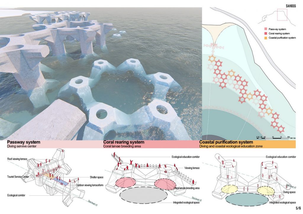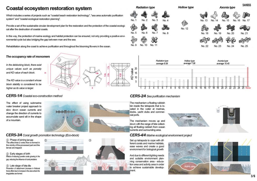Set up tetrapods to cope with different corals and marine habitats, ease waves and create a good environment for biological growth