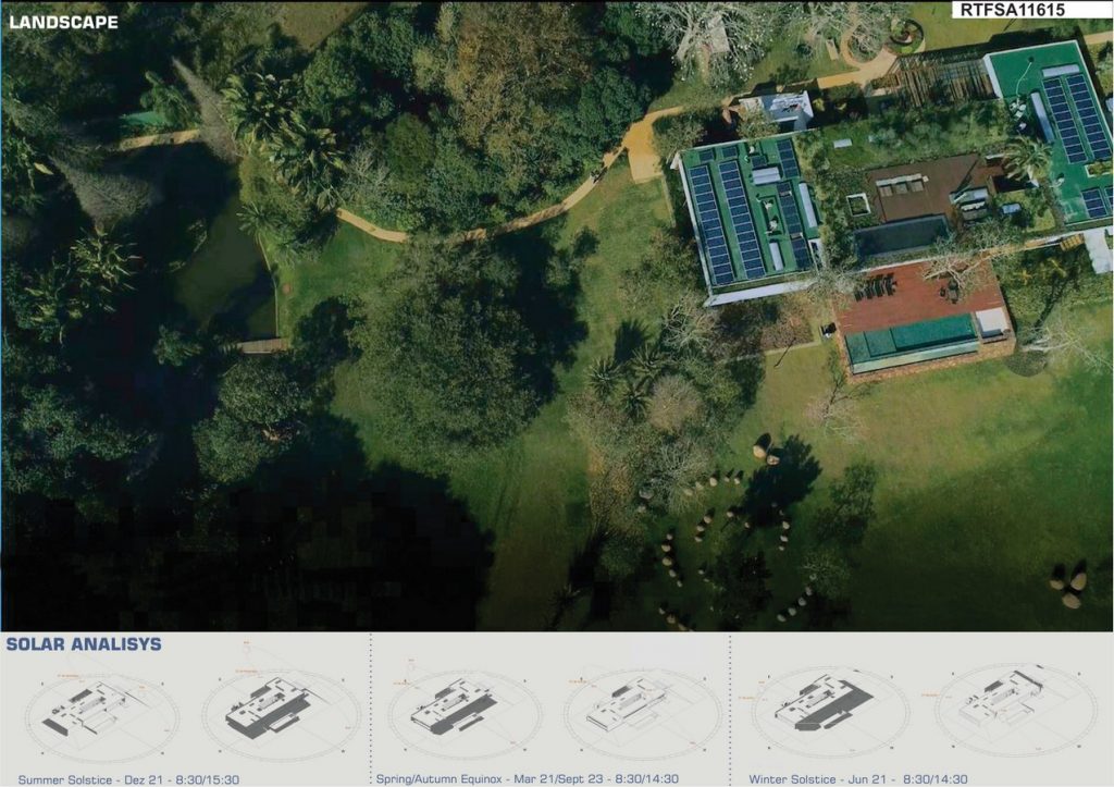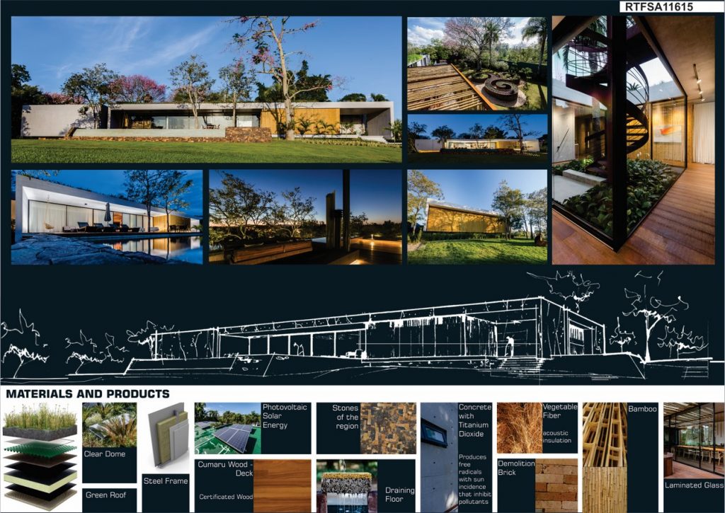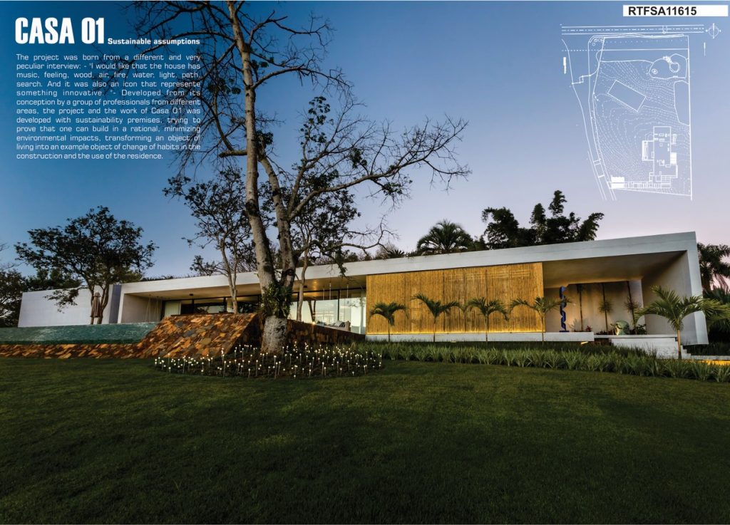 In addition, Casa 01 also has several other aspects that have been designed, from its design, to reduce environmental impacts. They are: waste management plan, Integrated System Ecosewer that reuses water for irrigation of the land, use of photovoltaic panels and the need for air conditioning for cooling or heating of the residence because special attention has been given to cross ventilation, natural lighting, Solar orientation and use of Ecoroof – Medium Laminar System.