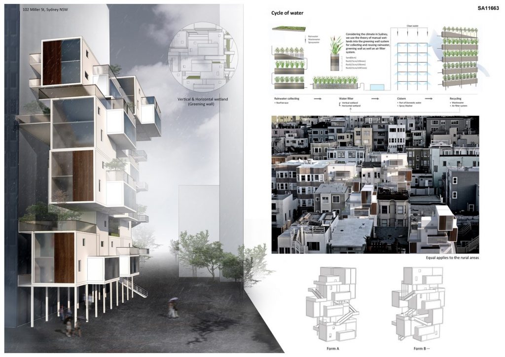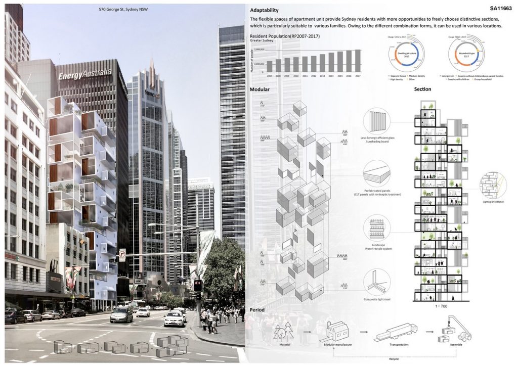 The mean idea of this design is modular system, which uses four different prefabricated units to realize fast and low-cost constructions. Furthermore, the vertical patchwork maximally tries to solve the overcrowded housing problem. Using the four different units and the combinations creates interesting and inclusive public spaces. We consider the lighting, ventilation, greening, eco-materials, water recycle system and multicultural residents in Sydney creating enjoyable, convenient and open spaces.