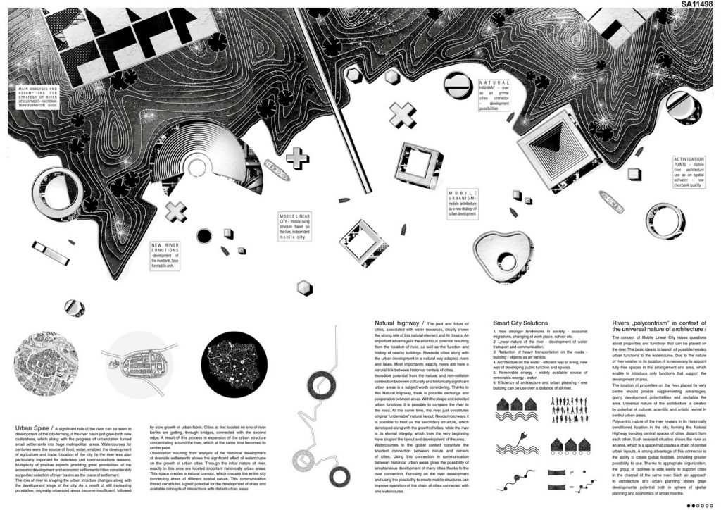 The main advantage is a line connection of city centers, offering great developmental potential. Mobile Linear City can be considered as “supplementing” city. Functions located by the river bank along with functions in the area of watercourse can complement each other or create new spatial advantages. Properties located on the water provide huge arrangement prospects with a possibility to create settlements on the river (thus can be used as a completely independent urban system).