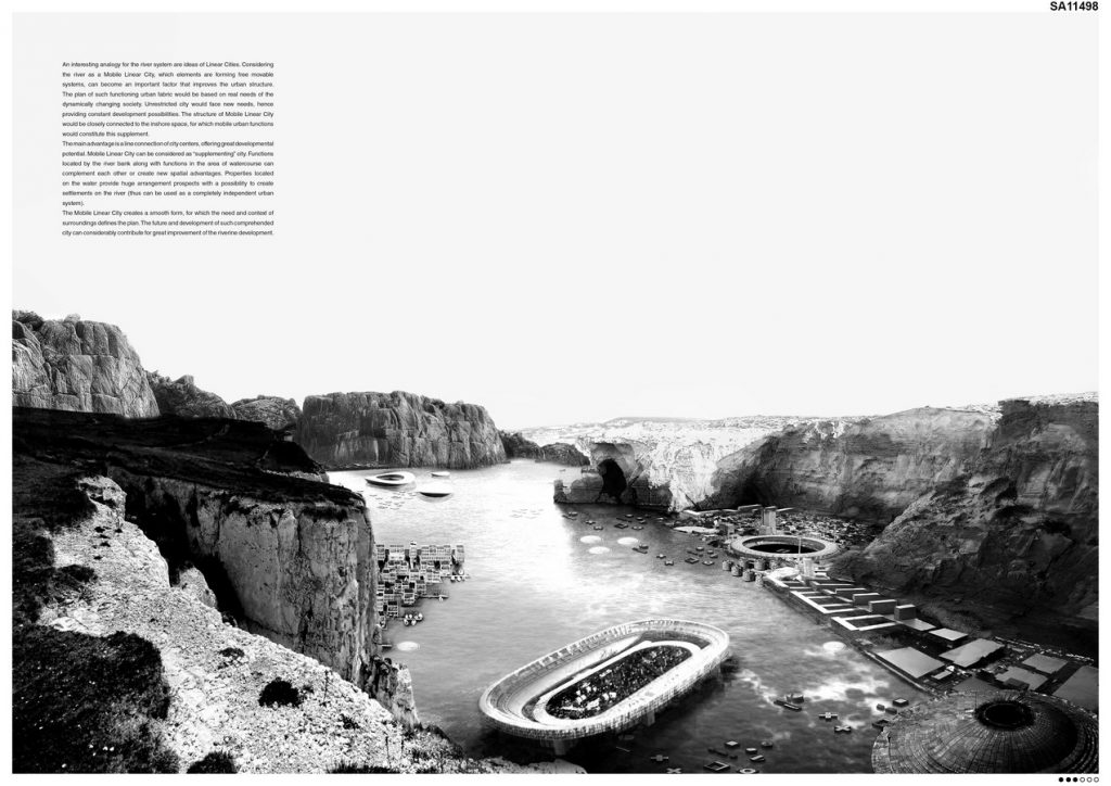 Mobile Linear City is a river development strategy aimed at holistic approach to development and co-operation between areas linked by the same waterway. This plan assumes the creation of a linear river city that will complement existing urban fabric on the one hand, and, on the other, create a chance for the development of independent residential settlements on the river. The aim of such a scheme of the city is to create the negative of existing cities, which, thanks to its mobility and flexibility, will be able to adapt easily to current and future social needs.