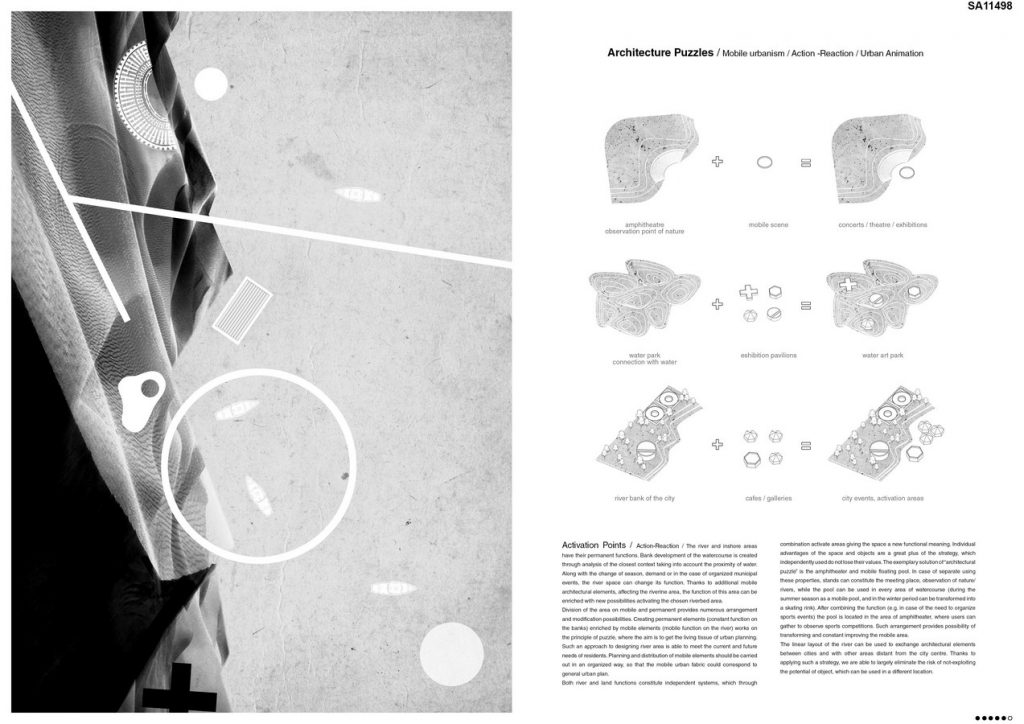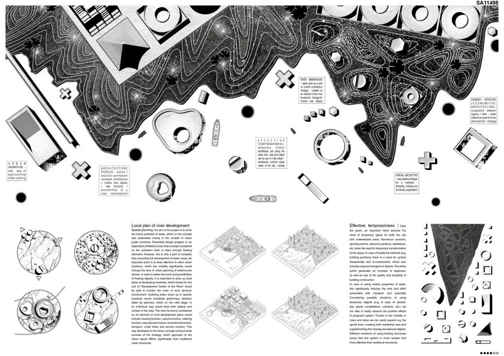 The starting point of the strategy is the inherent for the city presence of the river, which in its course passes all possible spatial functions (on the one hand, it runs through the largest metropolises and, on the other hand, crosses urban areas, villages as well as natural areas untouched by human activity), thereby combining areas of different spatial qualities into one continuous organism. This advantage makes it possible to plant mobile water elements on the river so that they transform the watercourse area into a linear urban structure. Such spatial development gives the possibility of free spatial arrangement which, on the one hand, complements existing buildings and, on the other hand, provides opportunities for spontaneous activation of the river area. The efficiency and temporariness of applied solutions create the opportunity for continuous changes and modifications that enable the continuous improvement of water cities, while meeting the expectations of a rapidly changing society.