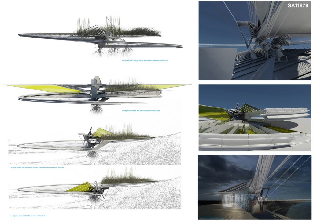 The house has a main superstructure which holds the living accommodation, it can move along a helicoid retaining wall, excavating as it does so. The building’s core is a reinforced concrete anchor under which a grid of root-like cable foundations spread, pinned into the landscape this anchor supports the superstructure by using a series of hydraulic column lifts which pivot to turn the building, excavating its own substructure as the main living area moves, the immediate context provides different levels into which the building can rotate, burying itself into the already partly excavated landscape to protect itself from the hurricane. The architecture is choreographed by the wind direction of the hurricane, turning with it.