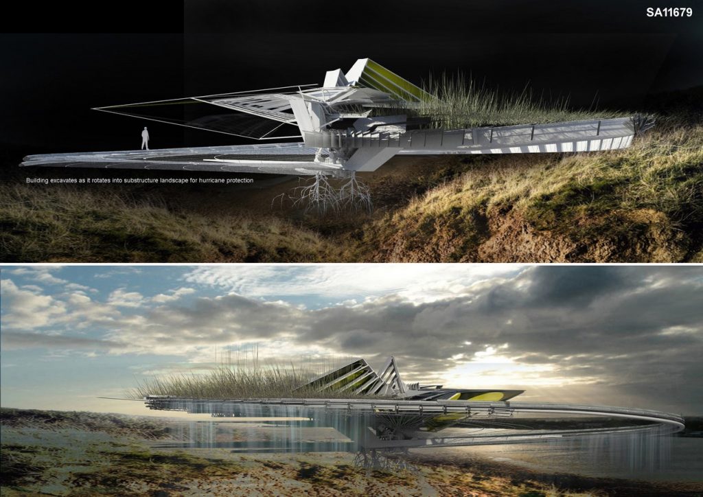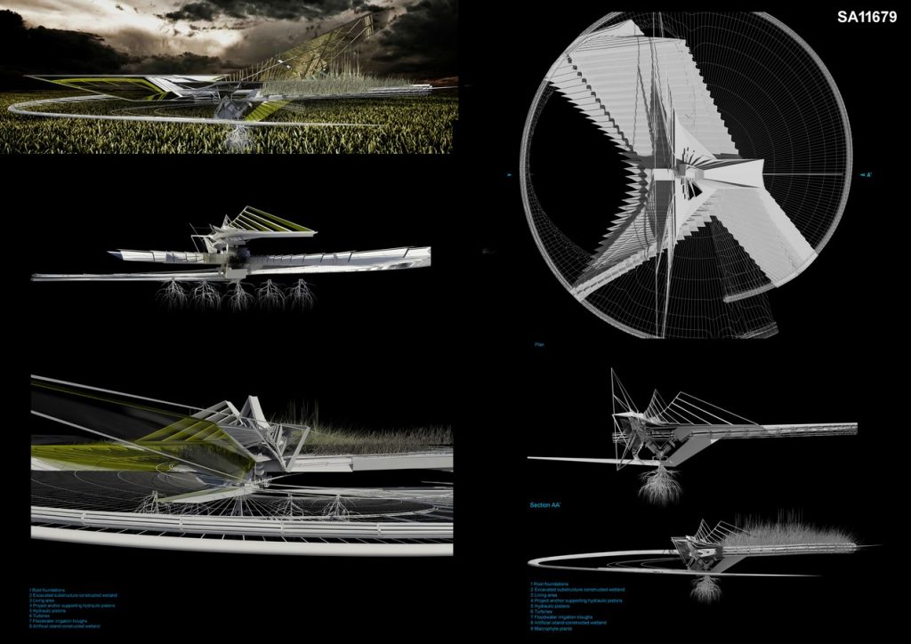 The building’s main living space is constructed from a pre-cast reinforced concrete frame, this lightweight structure has a series of rubber-coated, concertina wall sections, providing flexibility to adapt during the building’s movement and circulation needs. Macrophyte plants create a constructed wetland, this ecological residence aids land reclamation and water purification reducing any floodwater pollutants resulting from the hurricane.