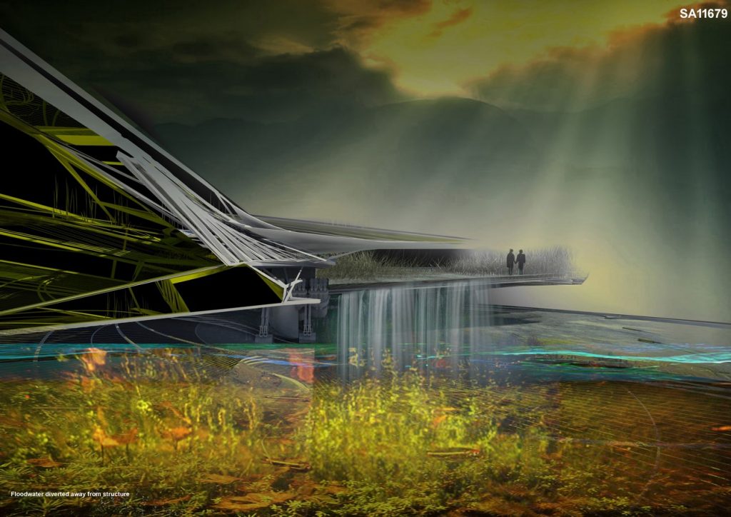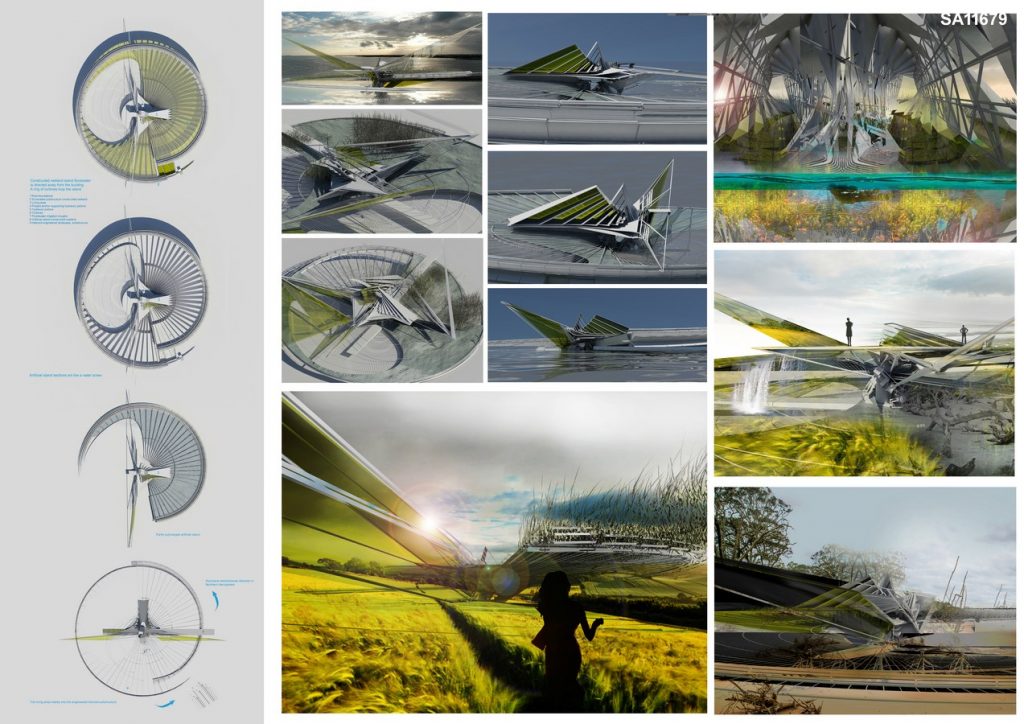 The excavated ground is pushed away whilst the artificial island surrounding the building acts as a canopy moving water away from the building. Solar panels line the island’s floor plate panels and edged by a ring of turbines, the turntable like design consists of sixty-four separate timber sections that act as an irrigation field directing rain and floodwater away from the building, these contained sections are deeper closer to the building in order to help with efficient drainage, they act like a water screw.
