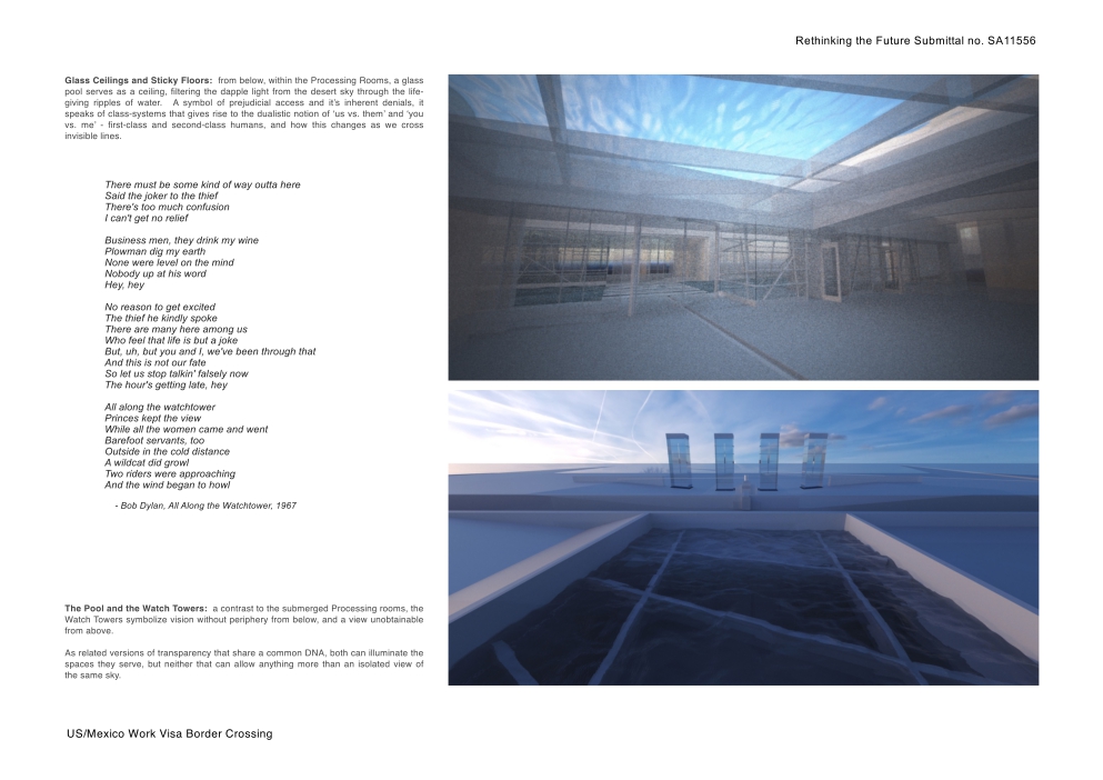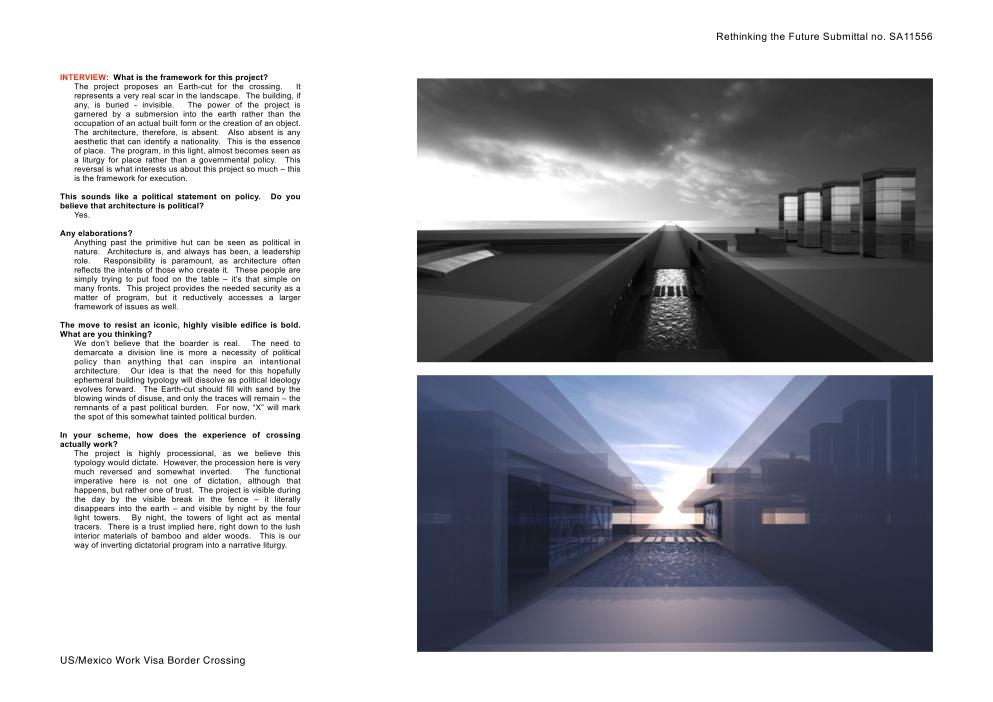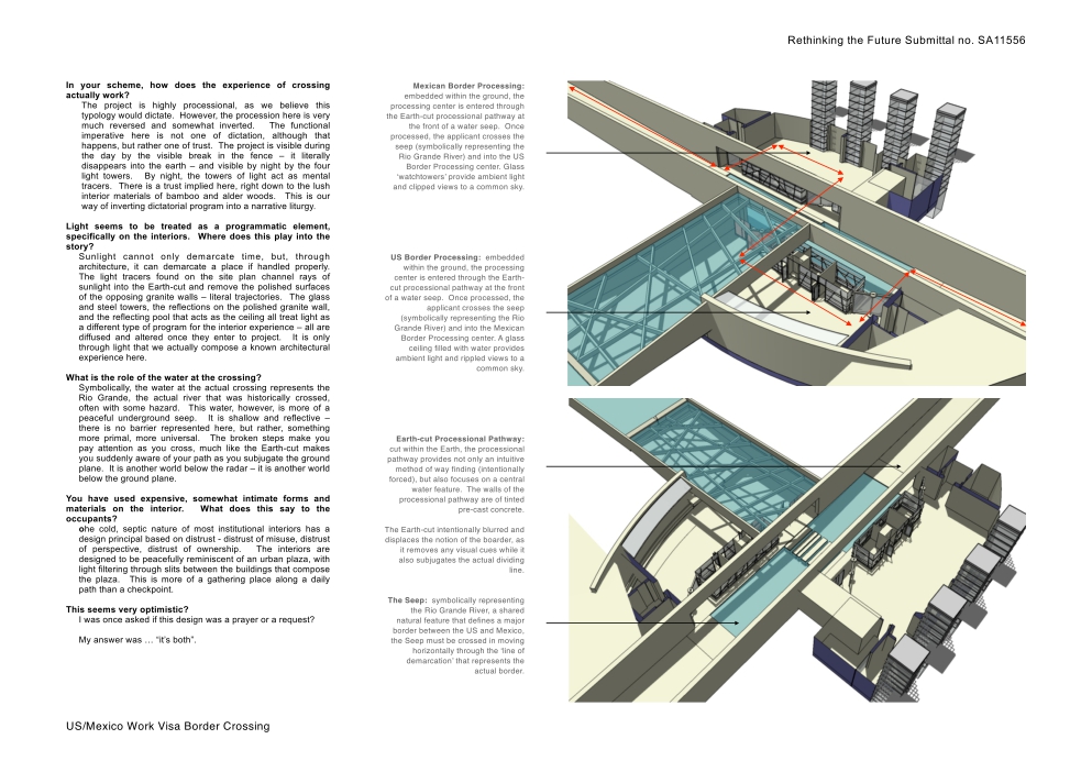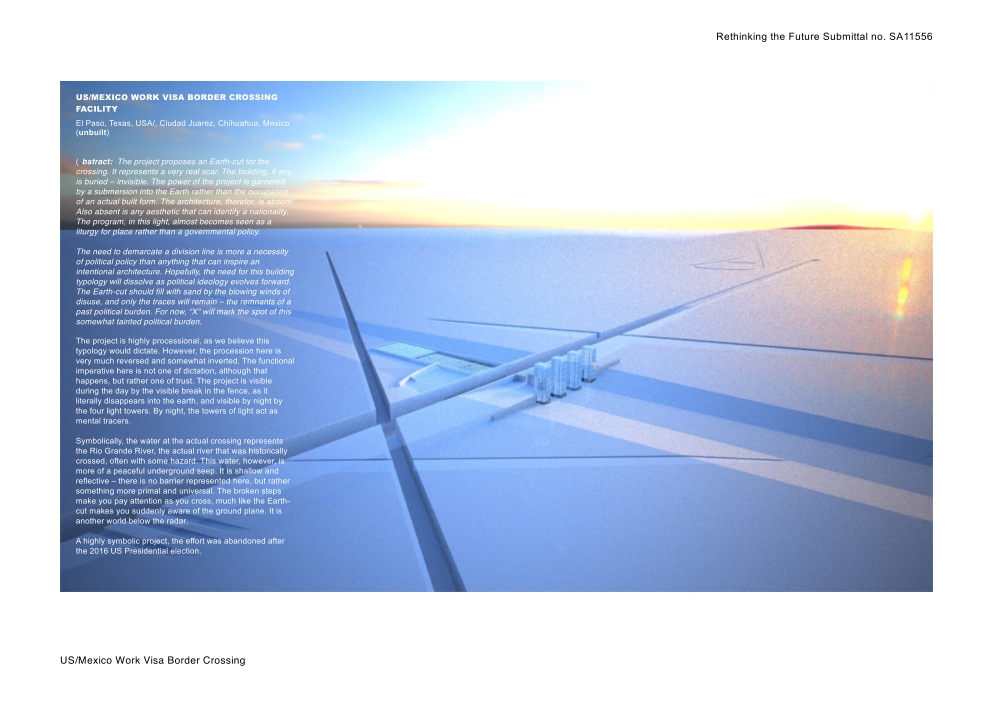 The project proposes an Earth-cut for the crossing. It represents a very real scar. The building, if any, is buried – invisible. The power of the project is garnered by a submersion into the Earth rather than the occupation of an actual built form. The architecture, therefor, is absent. Also absent is any aesthetic that can identify a nationality. The program, in this light, almost becomes seen as a liturgy for place rather than a governmental policy.