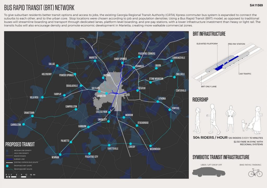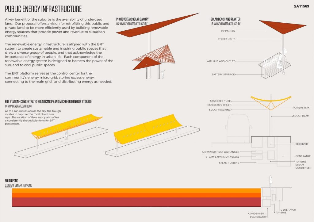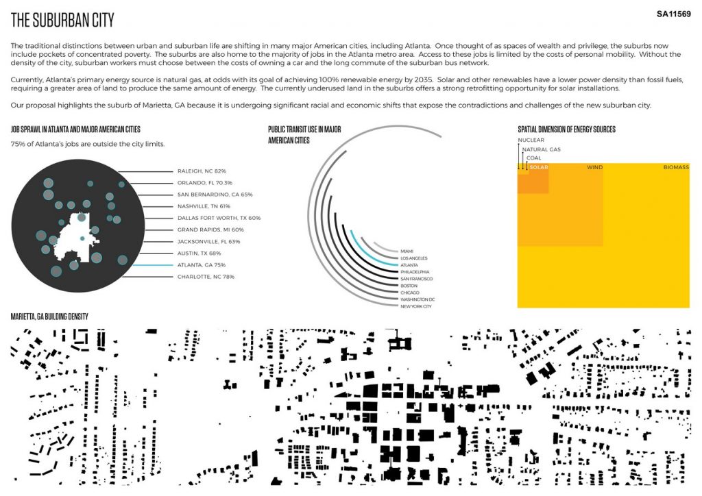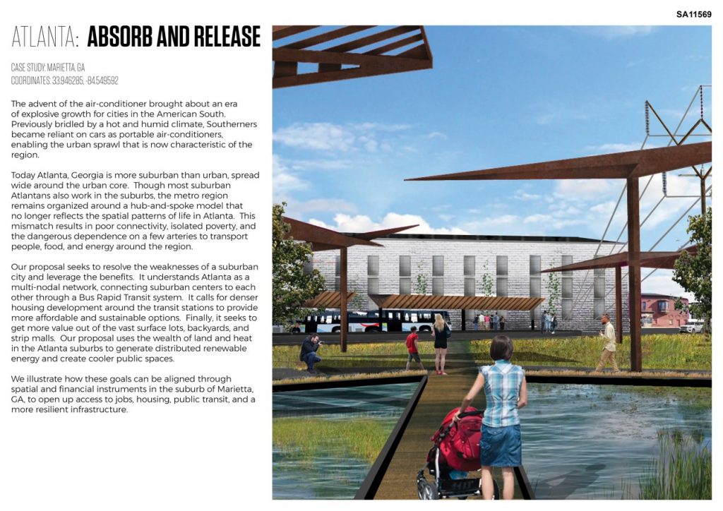 Our proposal seeks to resolve the weaknesses of a suburban city and leverage the benefits. It understands Atlanta as a multi-nodal network, connecting suburban centers to each other through a Bus Rapid Transit system. It calls for denser housing development around the transit stations to provide more affordable and sustainable options. Finally, it seeks to get more value out of the vast surface lots, backyards, and strip malls. Our proposal uses the wealth of land and heat in the Atlanta suburbs to generate distributed renewable energy and create cooler public spaces.