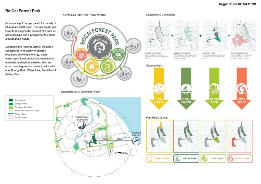 Slated as one of eight “green wedges” for the city of Shanghai’s 2040 Greenbelt Vision, the 2,600 acre Beicai Forest Park looks to reimagine the concept of a park. Deemed as a global city, Shanghai will deliver a park that is self-sustaining and a provider for the city’s future demands.