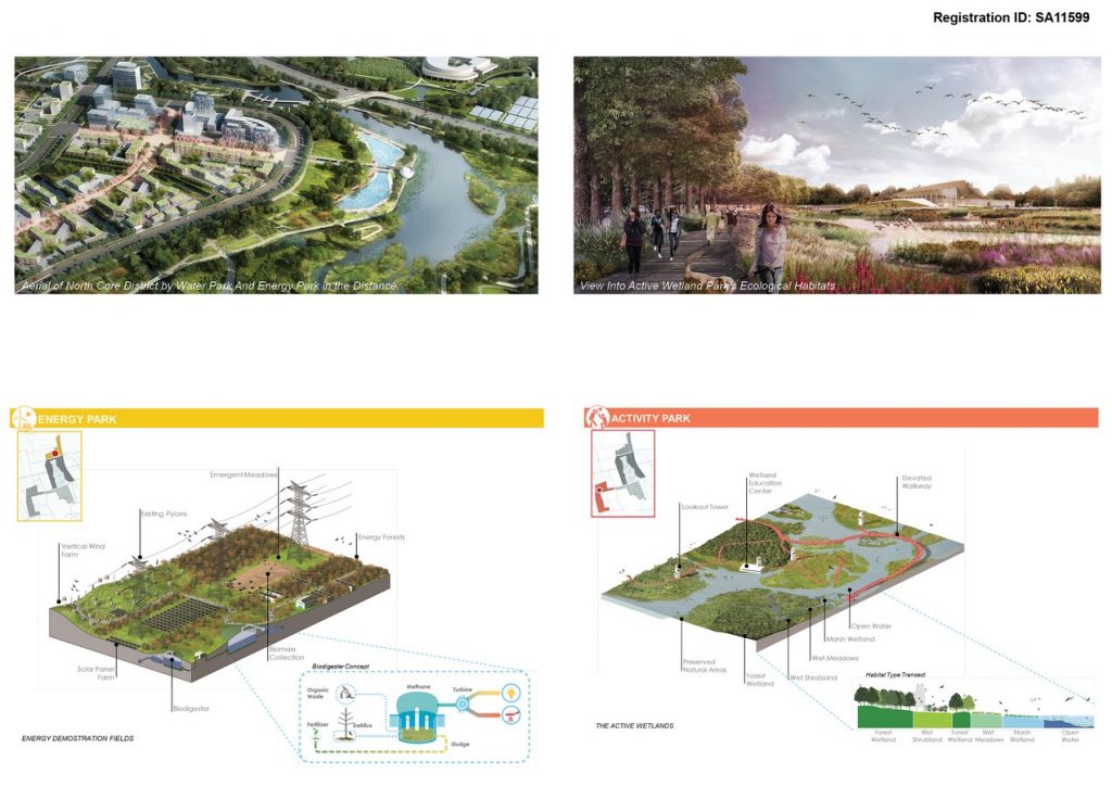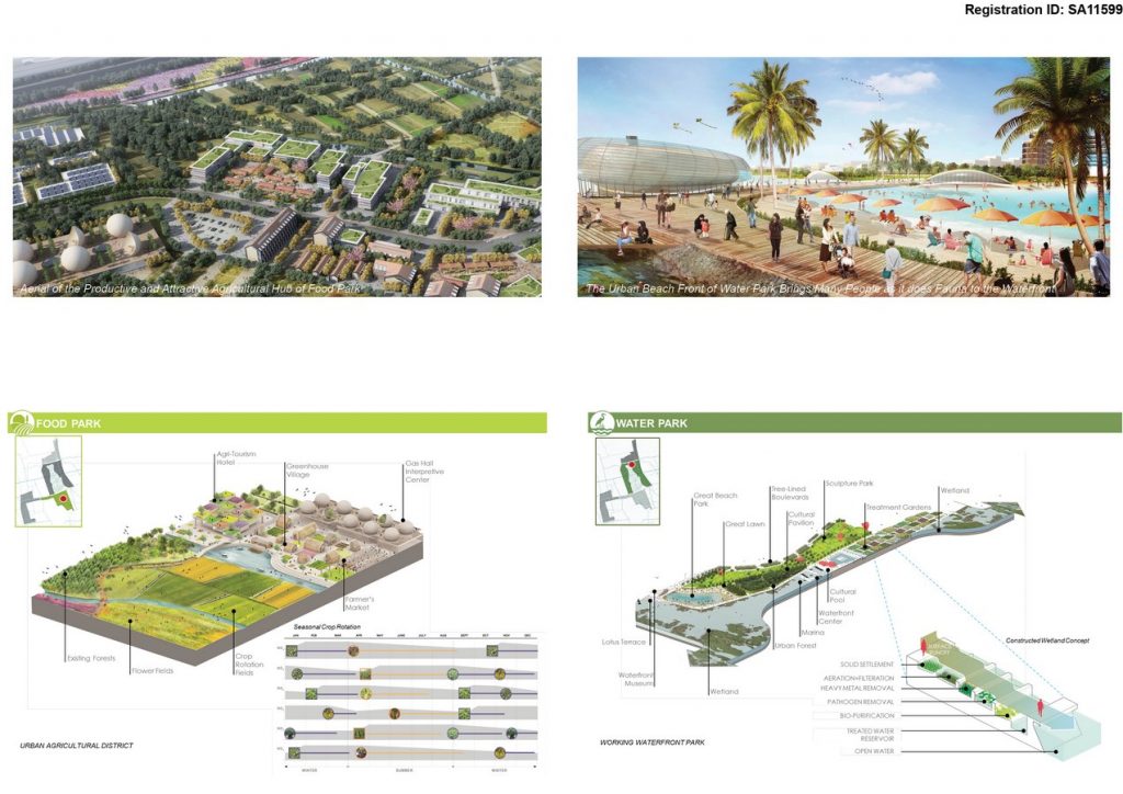 The urban core hosts transit-oriented developments with residential, commercial and offices; Water Park encases the core giving it the immediate needs of recreational amenities. With urban beach, esplanades, marinas and open waters, it will be a park brimming with aquatic activities. It also becomes a working waterfront by treating the core’s storm water runoff before releasing it to the city’s river network. Collected graywater will be cleaned through the urban wetland parks for potential reuse. Water serves both important landscape and sustainability functions in this demonstration zone.