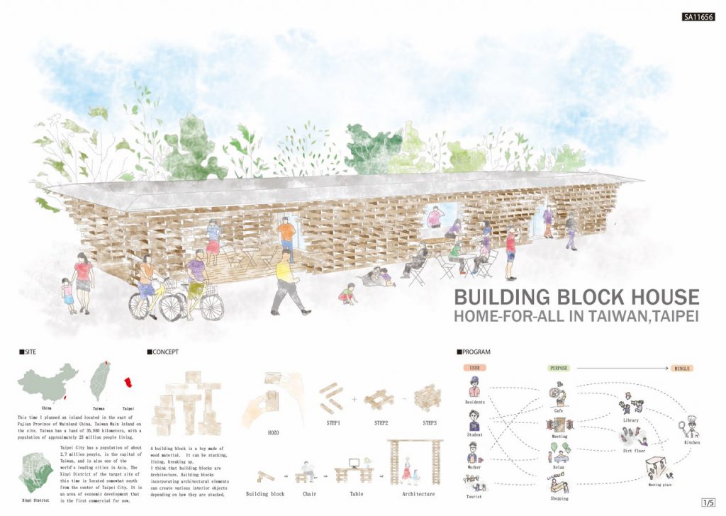 This time I planned an island located in the east of Fujian Province of Mainland China, Taiwan Main Island on the site. Taiwan has a land of 35,980 kilometers, with a population of approximately 23 million people living. Taipei City has a population of about 2.7 million people, is the capital of Taiwan, and is also one of the world’s leading cities in Asia. The Xinyi District of the target site of this time is located somewhat south from the center of Taipei City. It is an area of economic development that is the first commercial for now. A building block is a toy made of wood material. It can be stacking, lining, breaking up. I think that building blocks are Architecture. Building blocks incorporating architectural elements can create various interior objects depending on how they are stacked.