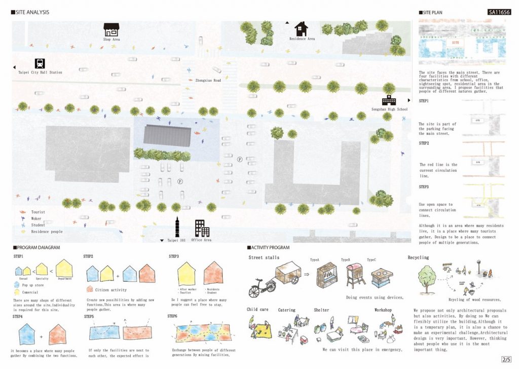 I propose not only architectural proposals but also activities. By doing so We can flexibly utilize the building. Although it is a temporary plan, it is also a chance to make an experimental challenge. Architectural design is very important. However, thinking about people who use it is the most important thing.