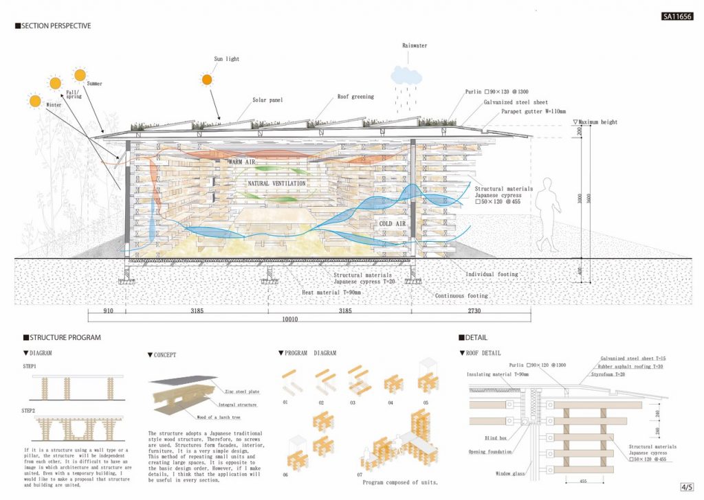 The structure adopts a Japanese traditional style wood structure. Therefore, no screws are used. Structures form facades, interior, furniture. It is a very simple design. This method of repeating small units and creating large spaces. It is opposite to the basic design order. However, if I make details, I think that the application will be useful in every section.