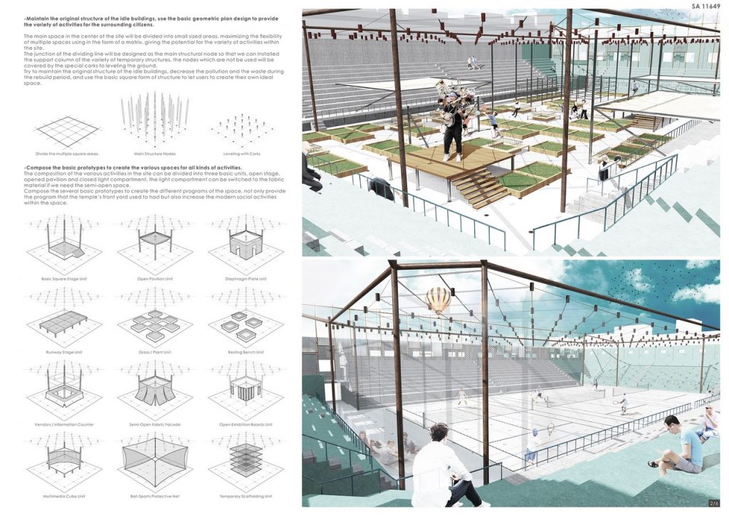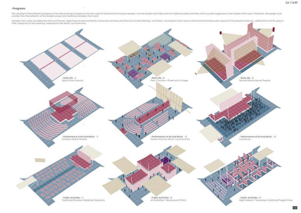 The concept of the different programs of the idle buildings is based on the front yard of traditional Taiwanese temples, mix the modern activities and the traditional daily activities which usually happened in the temple’s front yard. Therefore, the design must contain the characteristic of the modern plaza and traditional temple’s front yard.