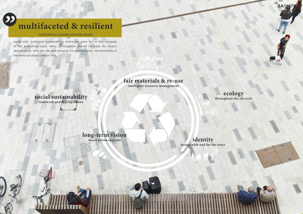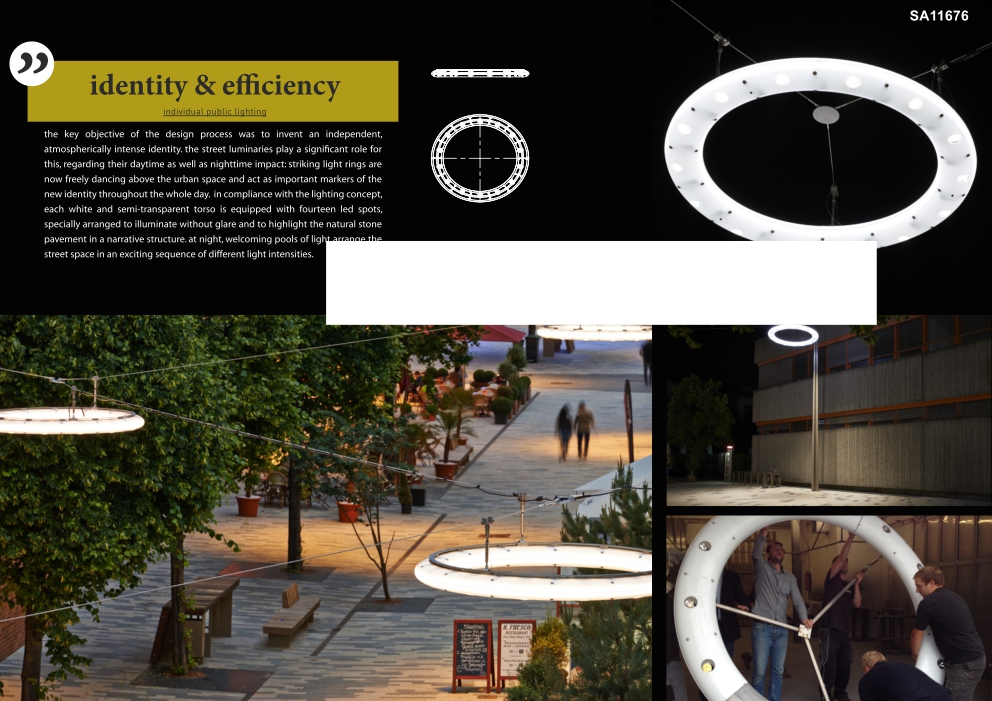 the spatial arrangement enables a unique choreography between the dialectic of commuters quickly passing through and others leisurely strolling around. the key objective of the design process was to invent an independent, atmospherically intense identity. the street luminaries play a significant role for this, regarding their daytime as well as nighttime impact: suspended, self-glimmering light-rings had already been suggested during the initial workshops. striking light rings are now freely dancing above the urban space and act as important markers of the new identity throughout the whole day. in compliance with the lighting concept, each white and semi-transparent torso is equipped with fourteen led spots, specially arranged to illuminate without glare and to highlight the natural stone pavement in a narrative structure, approaching the surrounding shopping realm. at night, welcoming pools of light arrange the street space in an exciting sequence of different light intensities.