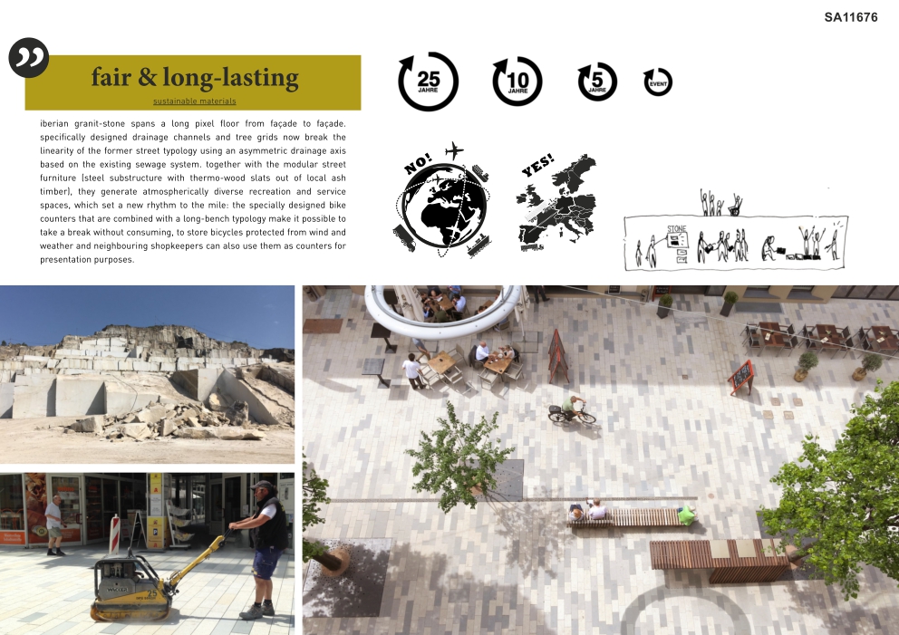 iberian granit-stone spans a long pixel floor from façade to façade. specifically designed drainage channels and tree grids now break the linearity of the former street typology using an asymmetric drainage axis based on the existing sewage system. together with the modular street furniture (steel substructure with thermo-wood slats out of local ash timber), they generate atmospherically diverse recreation and service spaces, which set a new rhythm to the mile: the specially designed bike counters that are combined with a long-bench typology make it possible to take a break without consuming, to store bicycles protected from wind and weather and neighbouring shopkeepers can also use them as counters for presentation purposes.