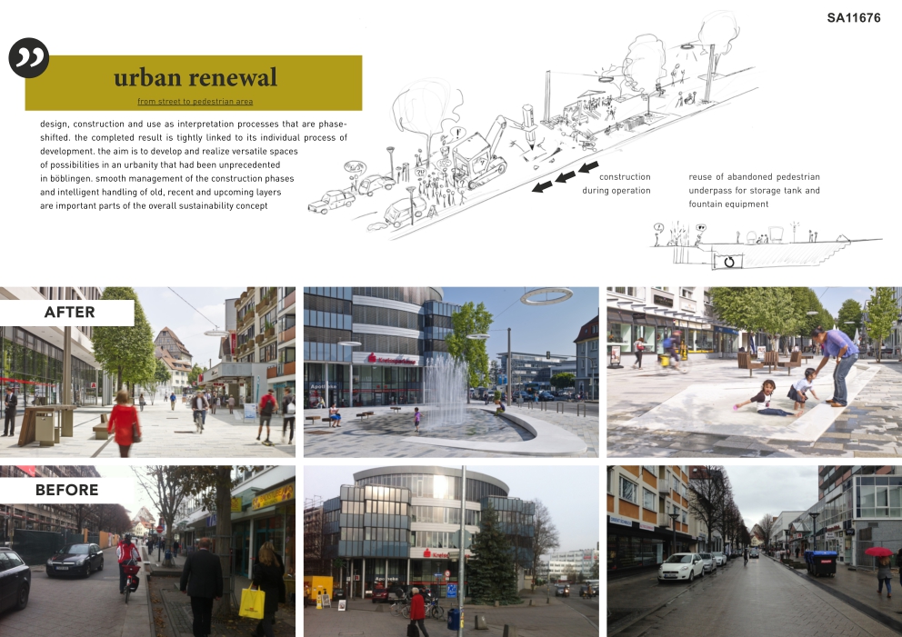The neue meile böblingen interprets a classical railway station street setting in a completely new way. having started out with an external view in the cooperative workshop, our task was to create a new „system of measurement“, a public space of reference for the city of böblingen. Hence, new qualities between a strip mall and recreational space were contrived in order to create a link between the old town and the railway station. these qualities were then refined during the participatory process and supported throughout the entire implementation process. based on numerous preliminary studies and a short design phase, a series of on-site visits as well as sampling and prototyping processes were carried out while closely cooperating with local stakeholders.