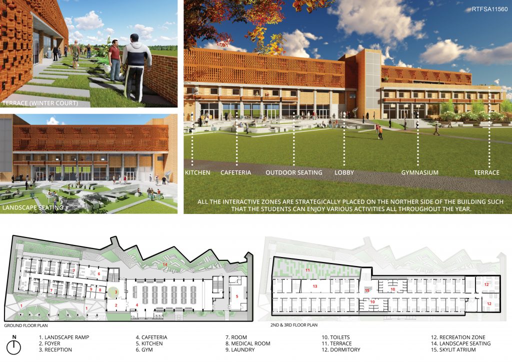 The hostel building celebrates and cherishes student life by harnessing student interaction, within the indoor spaces that percolate outward and interact, with the landscape around it.