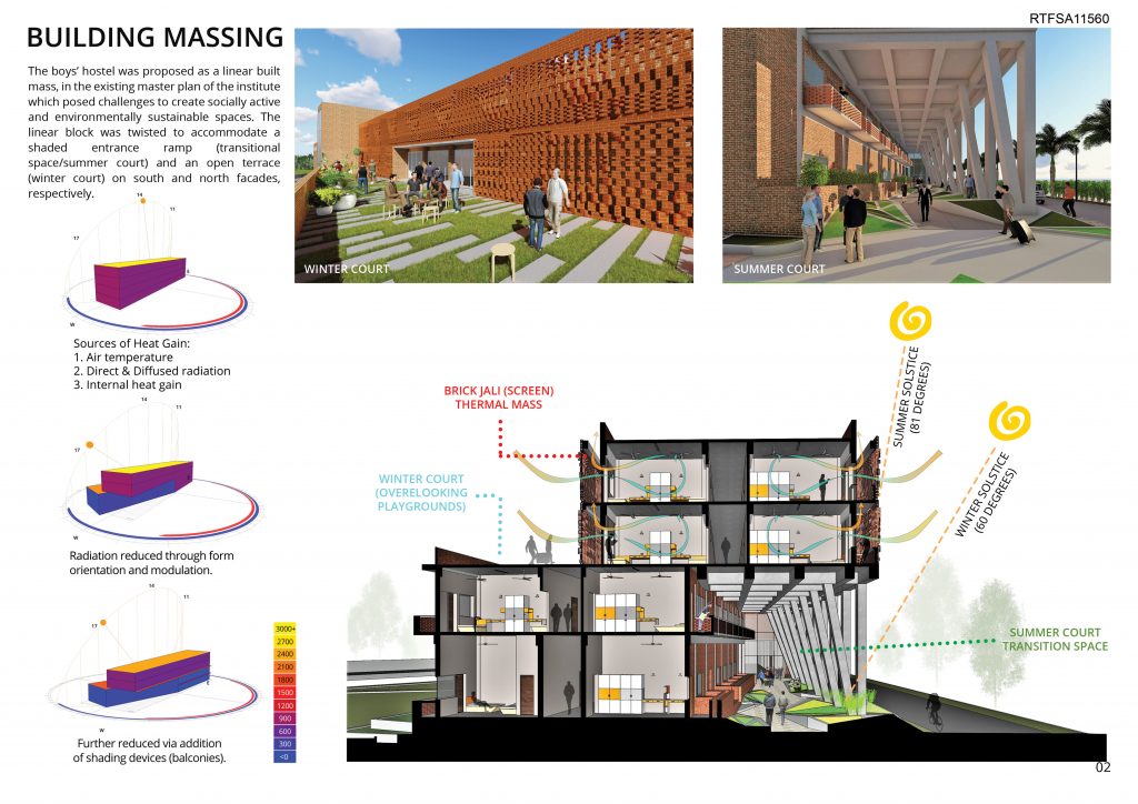 The boys’ hostel was proposed as a linear built mass, in the existing master plan of the institute which posed challenges to create socially active and environmentally sustainable spaces. The linear block was twisted to accommodate a shaded entrance ramp (transitional space/summer court) and an open terrace (winter court) on south and north facades, respectively.
