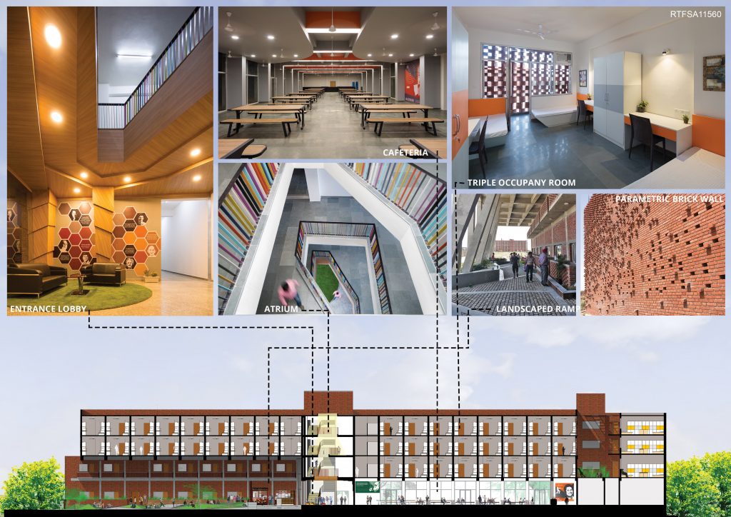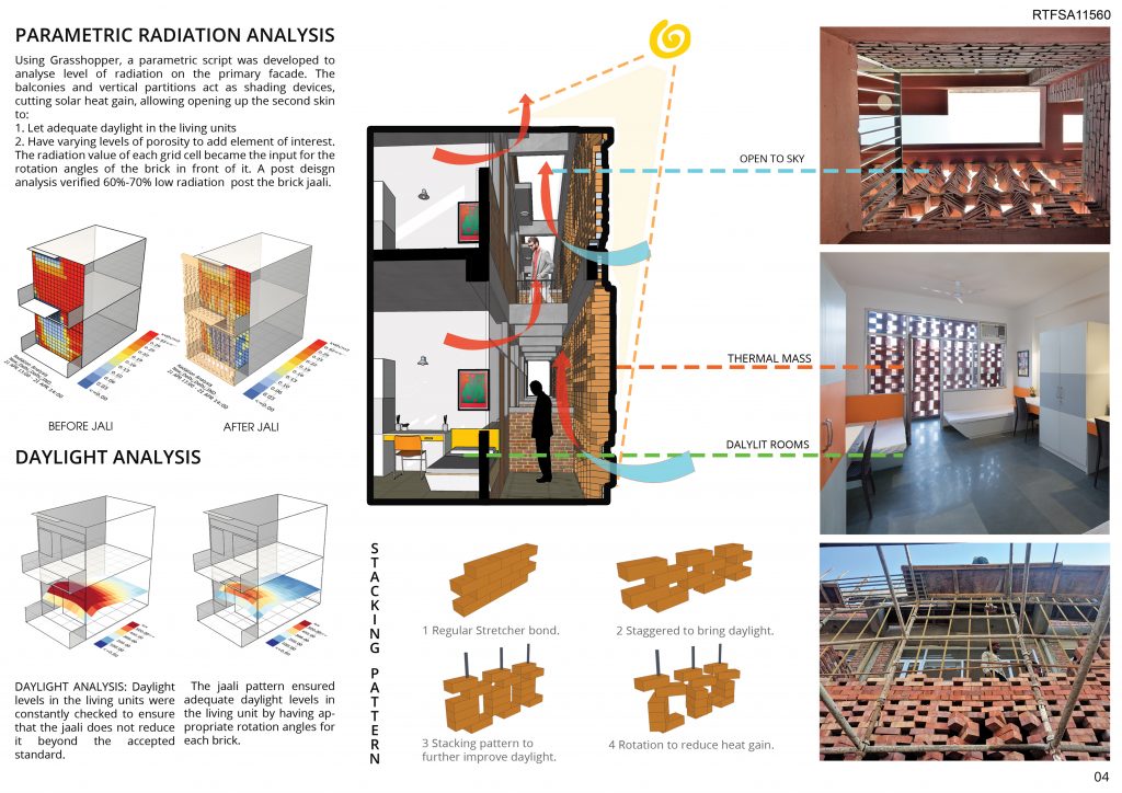 A brick jali, circumscribing the building acts as a secondary skin to the hostel and adds a unique character and texture to the façade of the building. The rotation angles of each brick were stimulated using software (Ecotect, Grasshopper) to minimize solar radiations and direct heat gain on the façade. The brick skin also accommodates balconies which further enrich student interaction. These balconies also act as a thermal buffer between indoor and outdoor spaces.